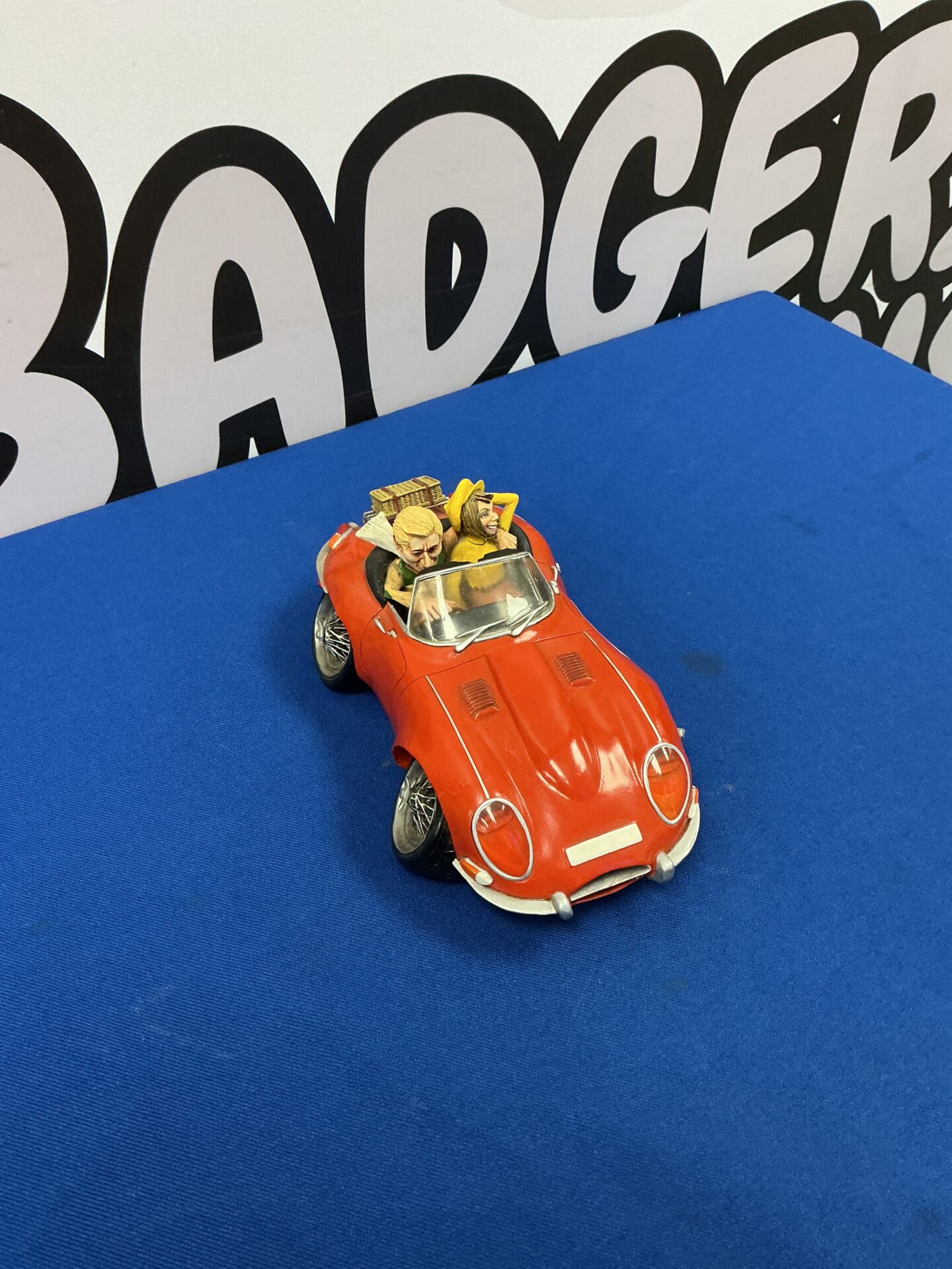 This charming ornament depicts a red car, likely inspired by classic roadsters, adorned with festive details. The miniature vehicle features a detailed interior and exterior, suggesting a focus on craftsmanship and design. It’s a delightful piece intended for seasonal display or as a collectible item for enthusiasts of automotive miniatures and holiday decorations.