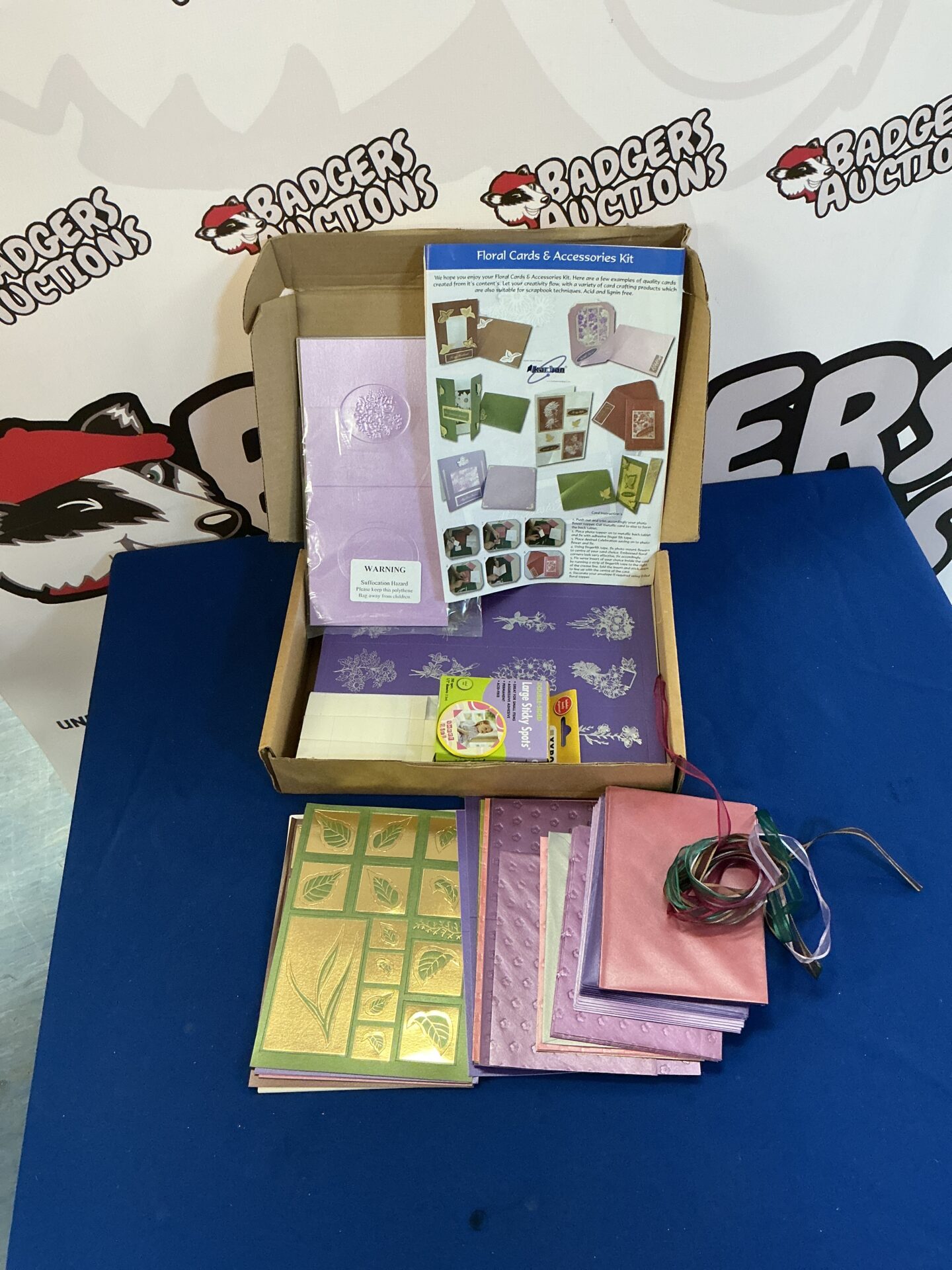 This lot comprises a collection of card making supplies, ideal for crafting enthusiasts. The assortment includes floral embossed paper, decorative papers in various patterns, coordinating envelopes, and ribbons for embellishment. This collection appears to be geared towards creating handmade cards and stationery with a floral theme, offering a range of materials for diverse designs.