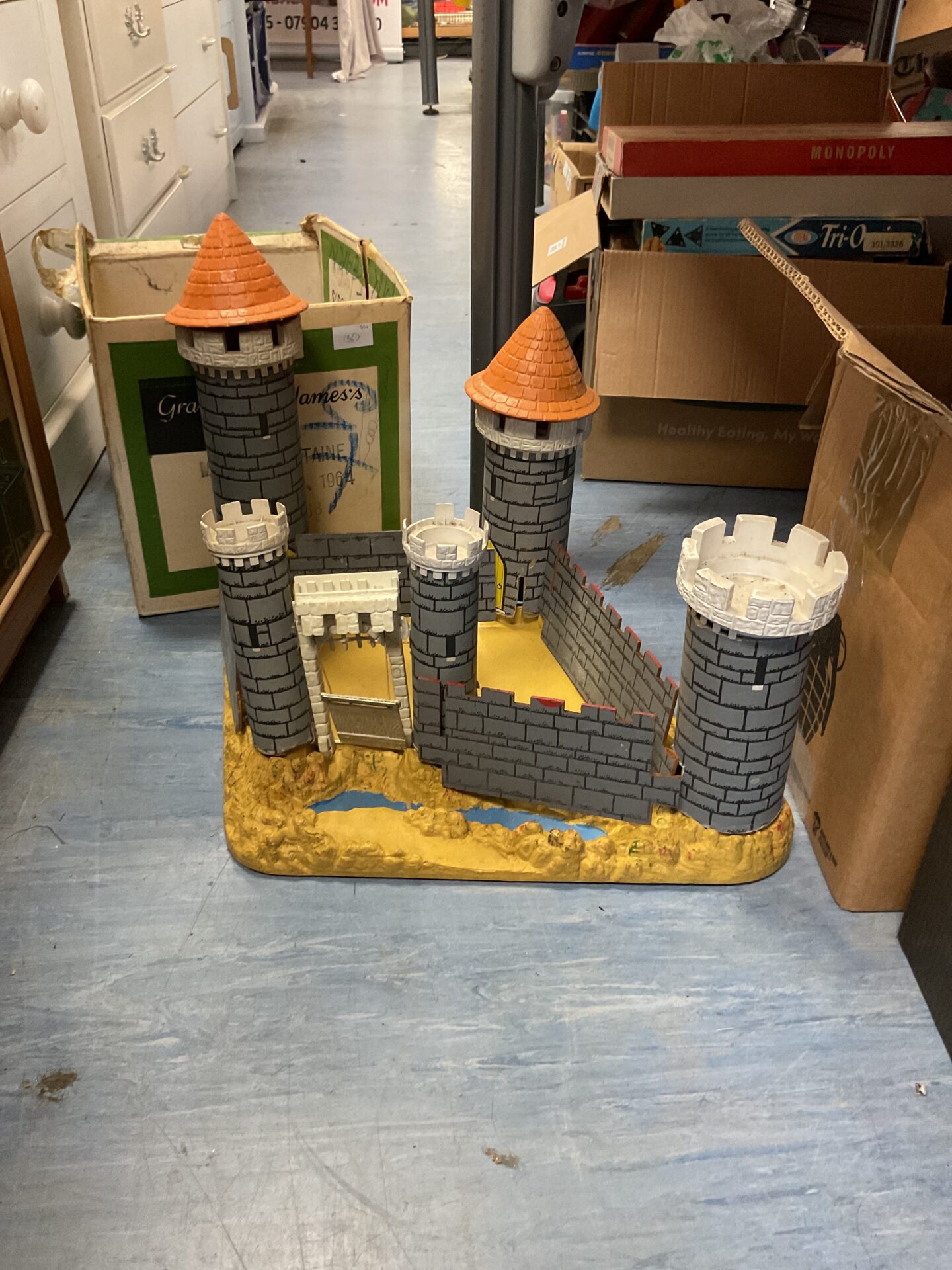 This vintage cardboard castle playset shows signs of wear consistent with age and play, adding to its character. While the cardboard may exhibit some creasing or minor damage, the overall structure remains intact. This collectible piece would appeal to toy enthusiasts, collectors of vintage playsets, or anyone seeking a nostalgic piece of childhood.