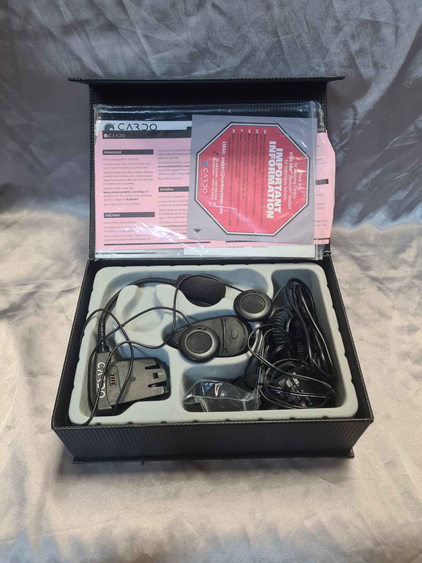 The item is presented as-found, with no assessment of functionality. The case shows signs of wear consistent with age and storage, and the contents have not been inspected for completeness or operational status. This Cardo system may appeal to motorcycle enthusiasts, collectors of vintage communication equipment, or those seeking parts for repair or restoration projects.