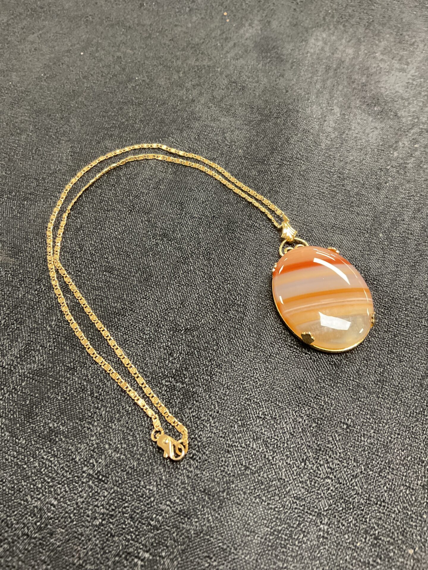 This is a vintage necklace featuring a striking carnelian pendant. The pendant is oval-shaped and displays warm orange tones with banded patterns characteristic of carnelian. It is suspended from an 18-inch chain, likely gold-plated, completing the classic retro aesthetic.