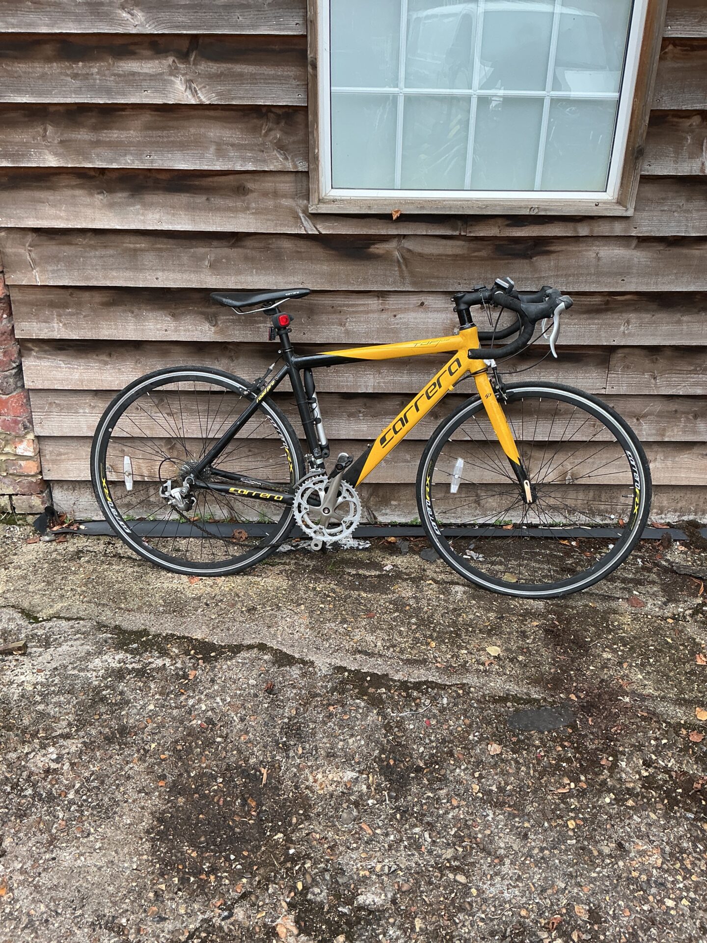 This is a Carrera TDF road bike, designed for performance and speed. The bike features a lightweight frame and components, typical of a professional-level road bike. Its design suggests it was intended for competitive cycling or fast-paced road riding, with a focus on aerodynamics and efficiency.