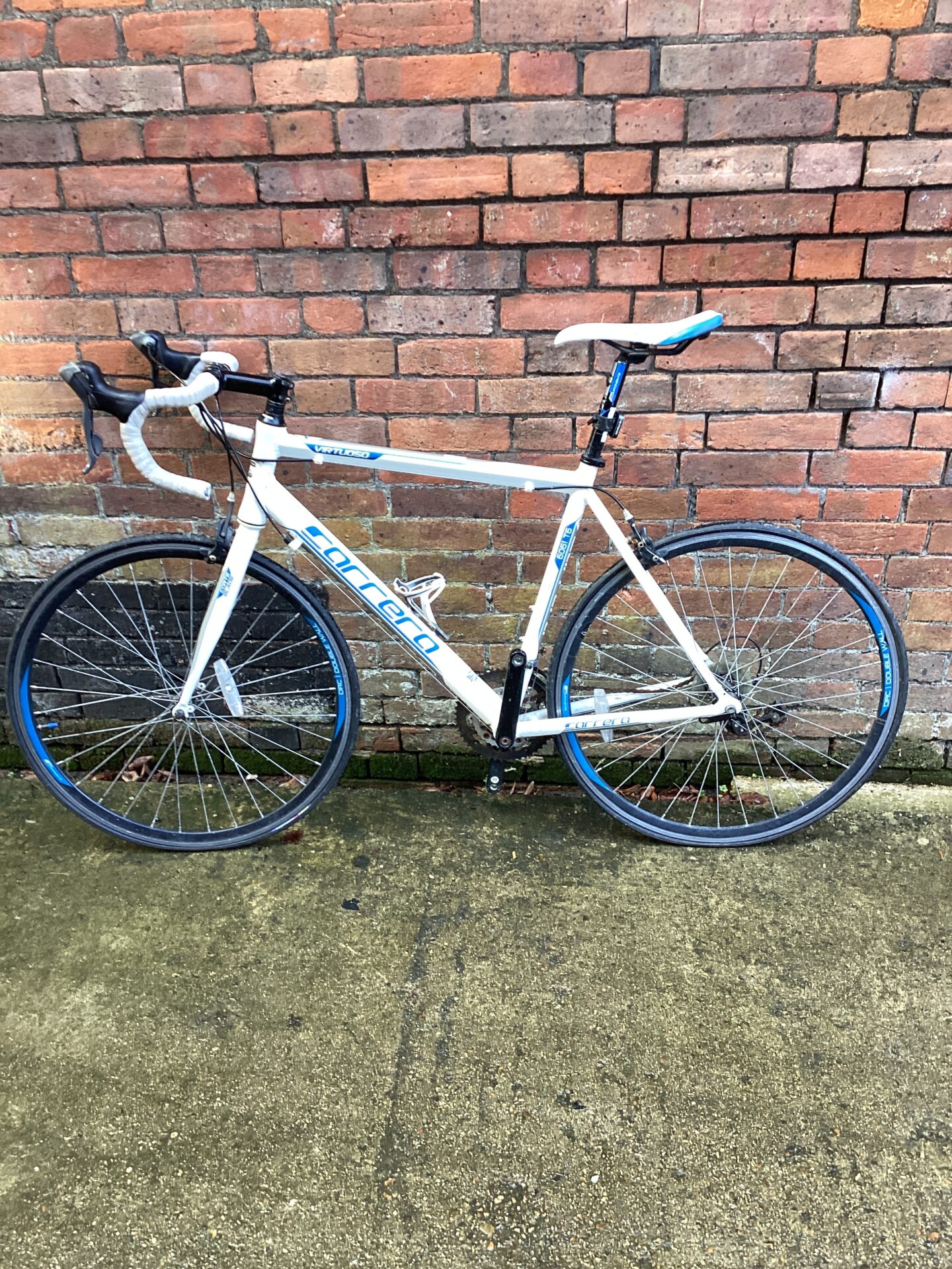 This Carrera Virtuoso racing bike is a classic road bike designed for speed and performance. It features a lightweight frame and sporty geometry, ideal for training or racing. Presented in used condition, this bike is perfect for enthusiasts or collectors.