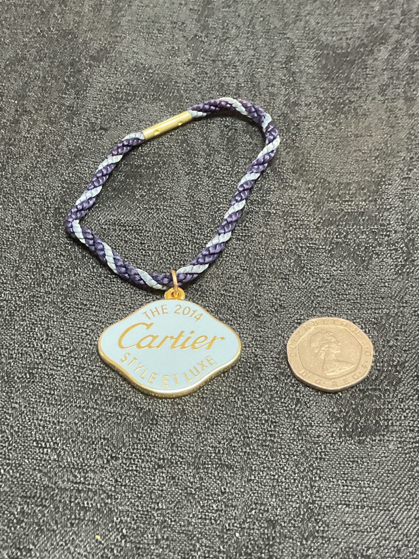 This is a gilt enamelled fob issued by Cartier in 2014, celebrating ‘Style Et Luxe’. The fob features a woven cord suspension, with a brass fitting at the top. The central fob is circular, with a yellow enamel face bearing the ‘Cartier’ name in elegant script, and the ‘Style Et Luxe’ text around the perimeter.