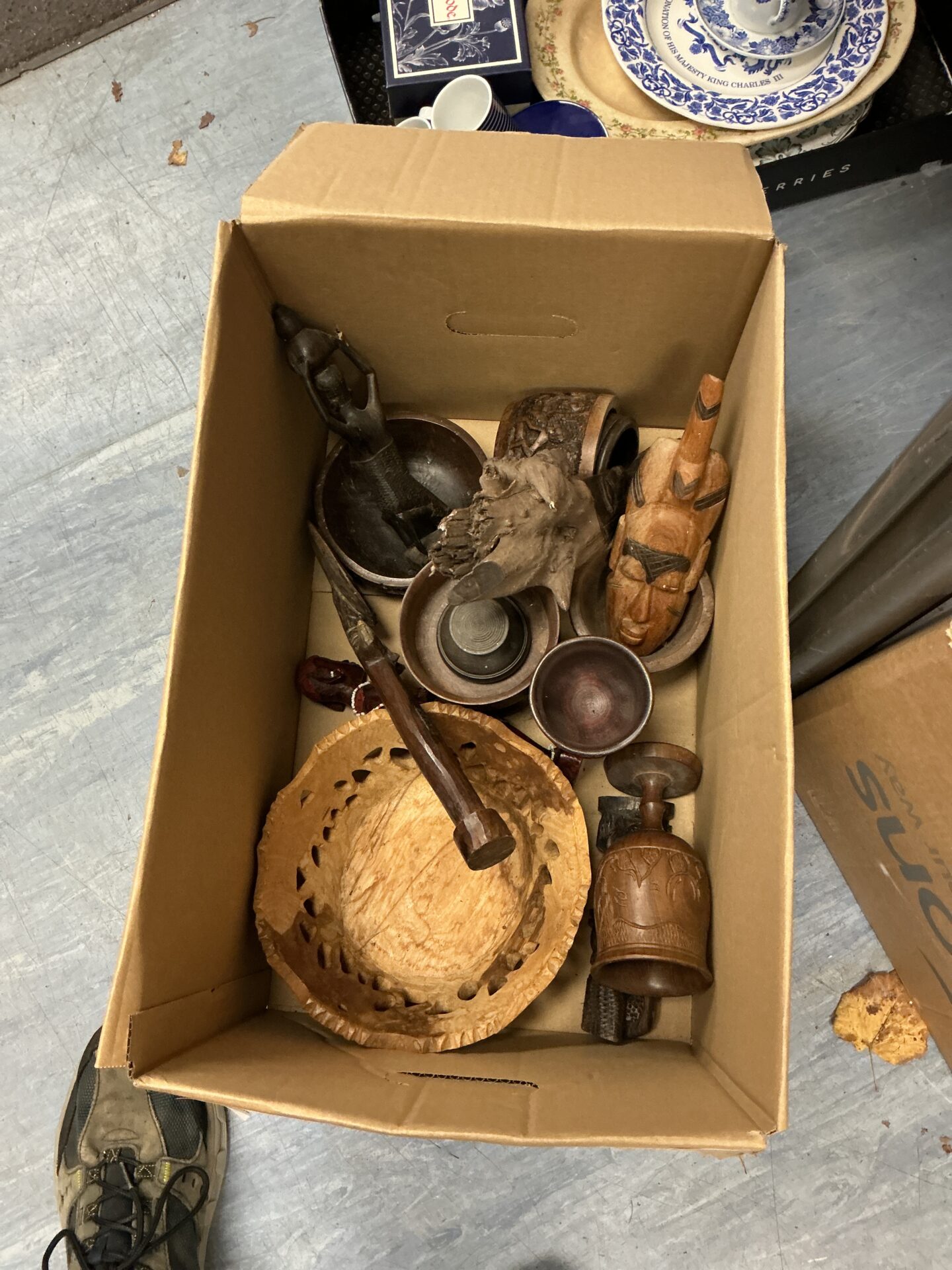 This lot comprises a collection of intricately carved wooden items. The selection includes a shallow fruit bowl, alongside various smaller decorative pieces. The style suggests a folk art influence, with a focus on natural forms and detailed craftsmanship. The wood appears to be a medium-density hardwood, likely chosen for its carving properties.