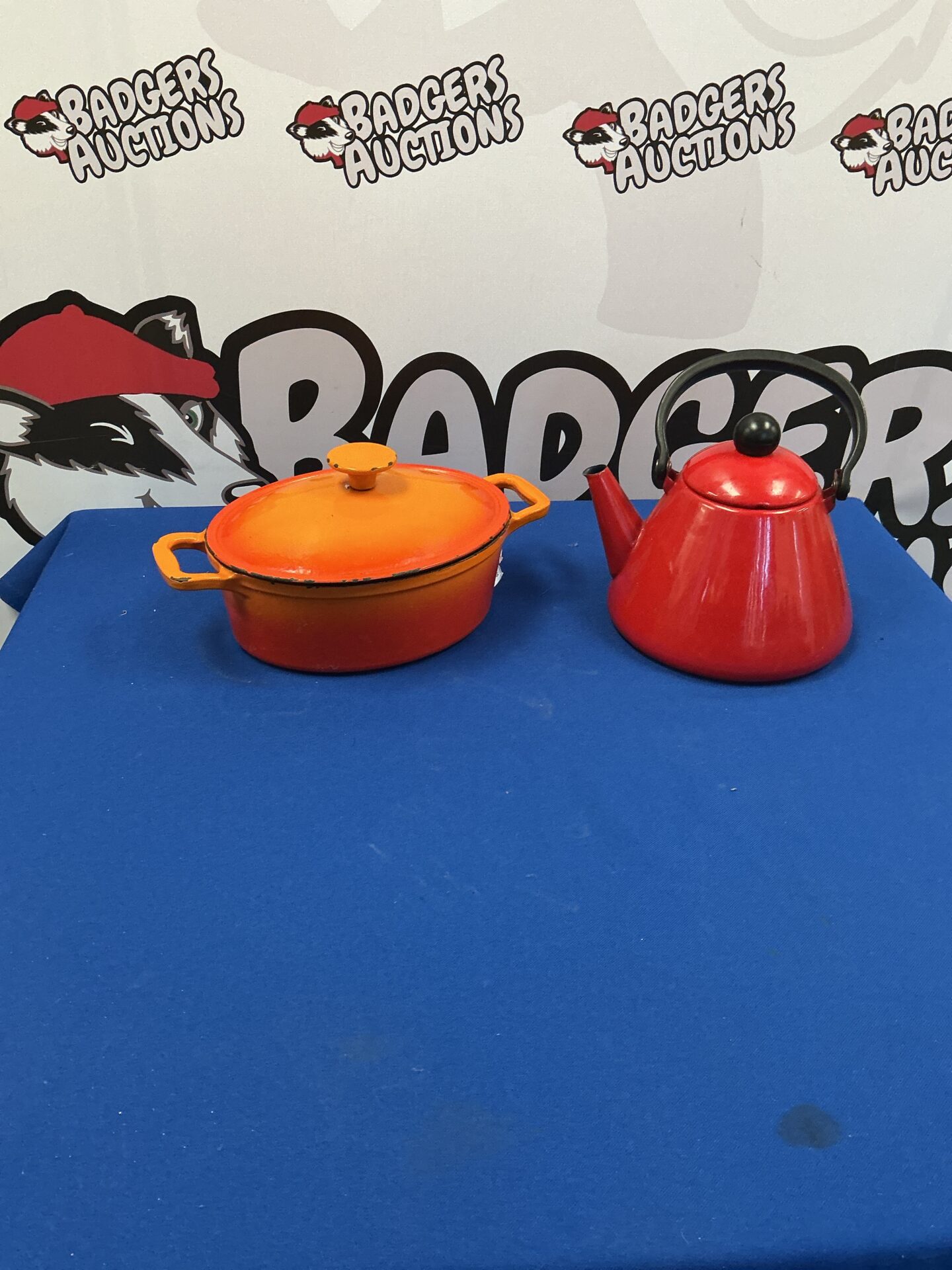 This lot features a vibrant red cast iron casserole dish accompanied by a matching metal kettle. The casserole dish boasts a classic design, likely intended for slow cooking and retaining heat effectively. The kettle, constructed from metal, complements the casserole dish in colour and style, suggesting a coordinated kitchen set from a bygone era.