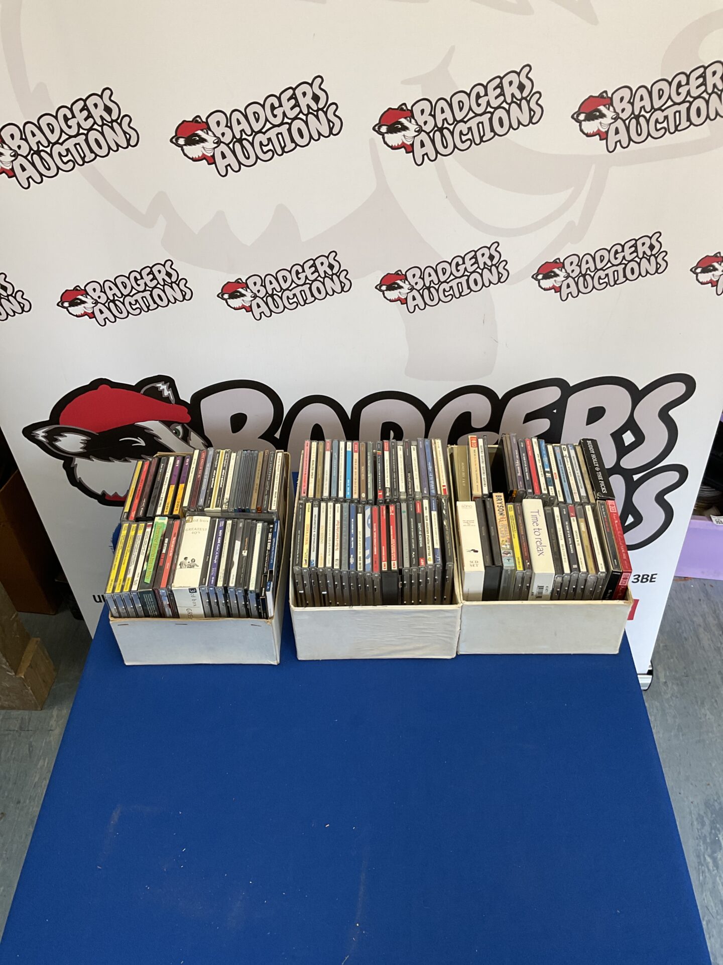 This lot comprises three boxes filled with a diverse collection of CDs. The collection appears to span various genres and artists, offering a wide range of musical tastes. It’s a fantastic opportunity for music lovers and collectors to expand their libraries with a substantial number of albums.