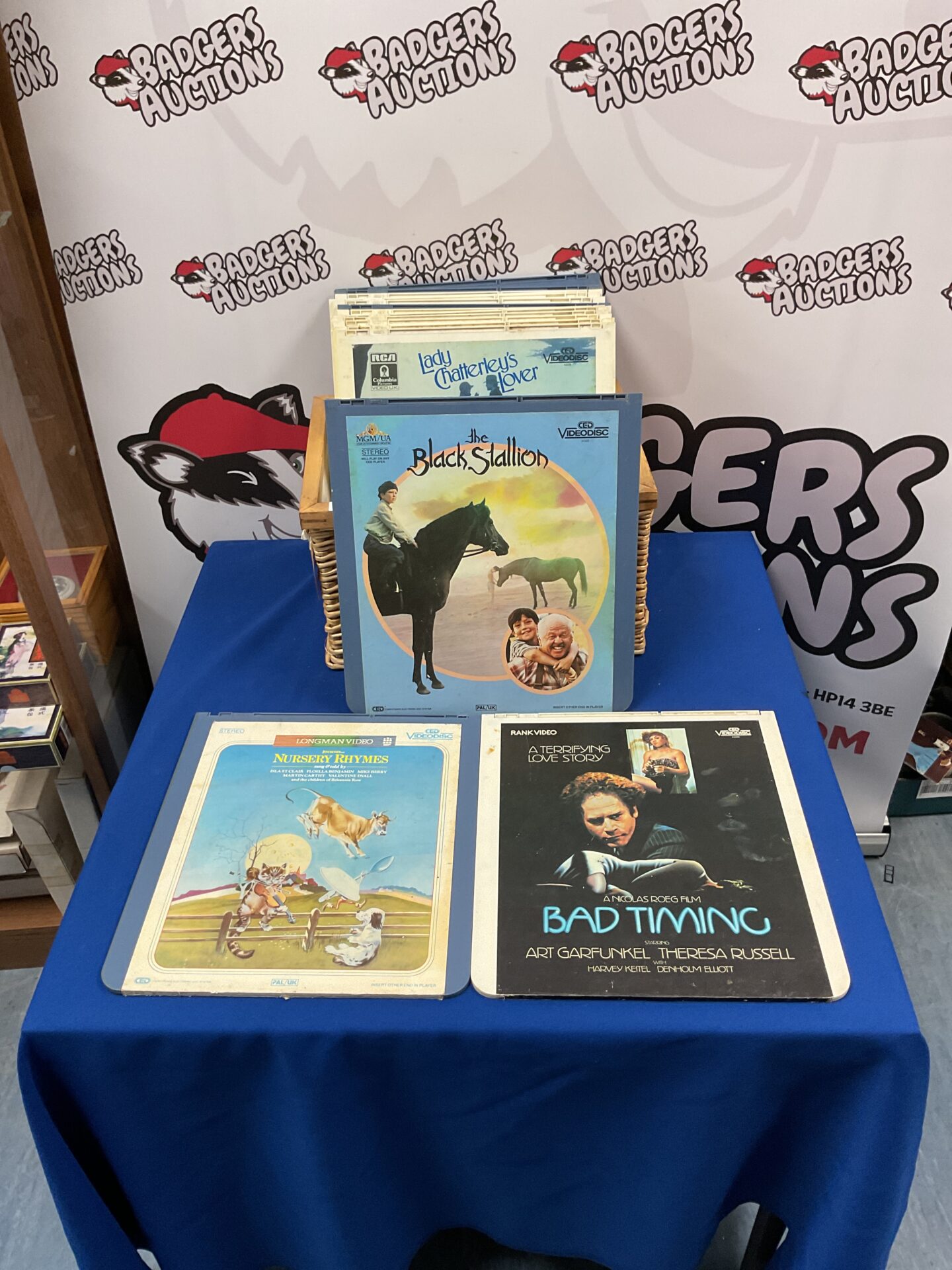 This lot comprises a collection of CED (Capacitance Electronic Disc) VideoDiscs, a now-obsolete analog video format released by RCA in the early 1980s. These discs resemble vinyl records but are read by an electronic sensor rather than a needle. The collection appears to include a variety of titles, offering a glimpse into the entertainment options available during that era.