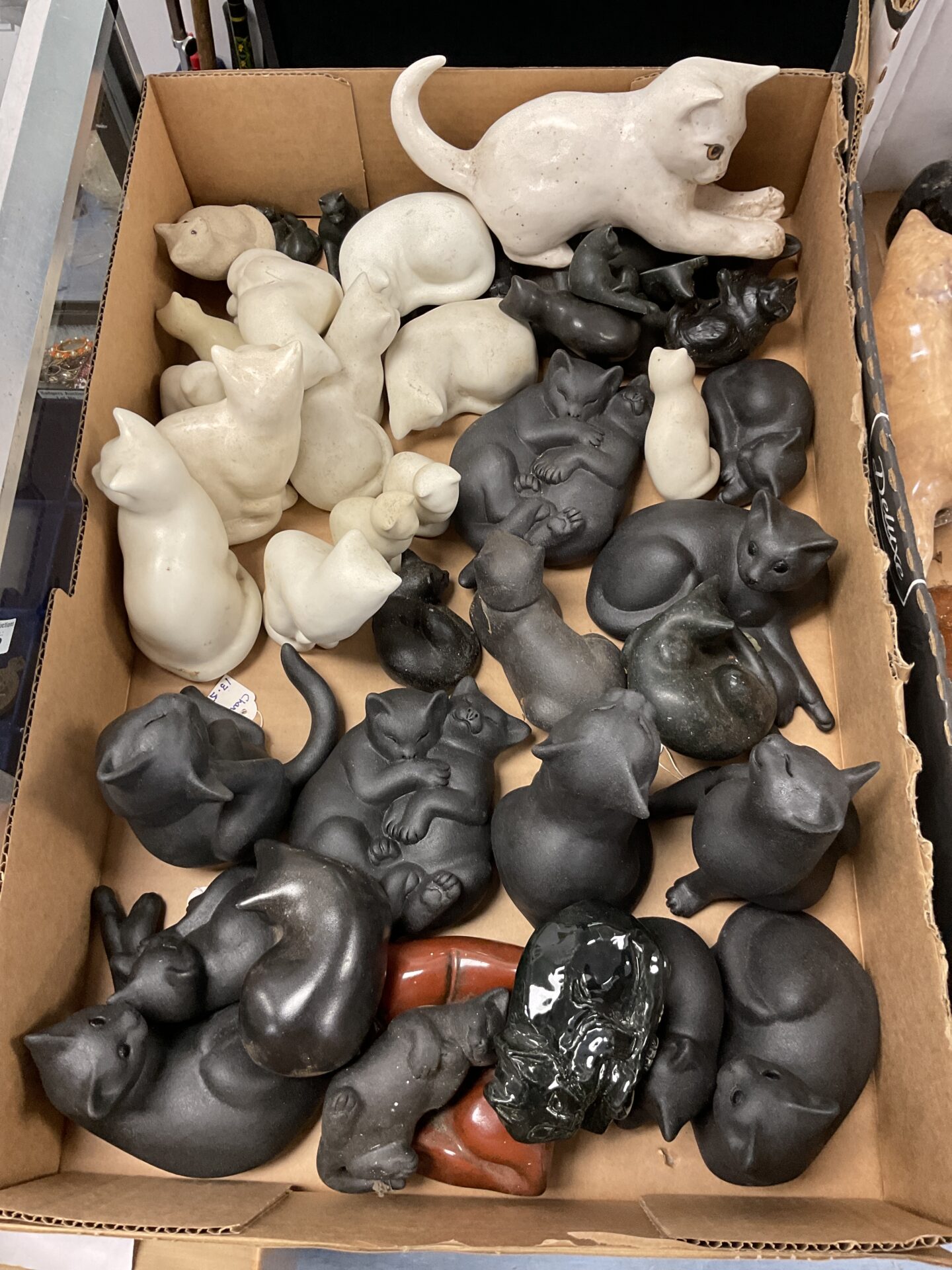 This lot comprises a large collection of charming ceramic cat figures, presented in a striking black and white colour scheme. The figures vary in pose and size, offering a diverse and visually appealing assortment. These pieces appear to be crafted from a durable ceramic material, suggesting they are intended as decorative objects for display. The collection evokes a sense of whimsy and would be a delightful addition to any cat lover’s home.