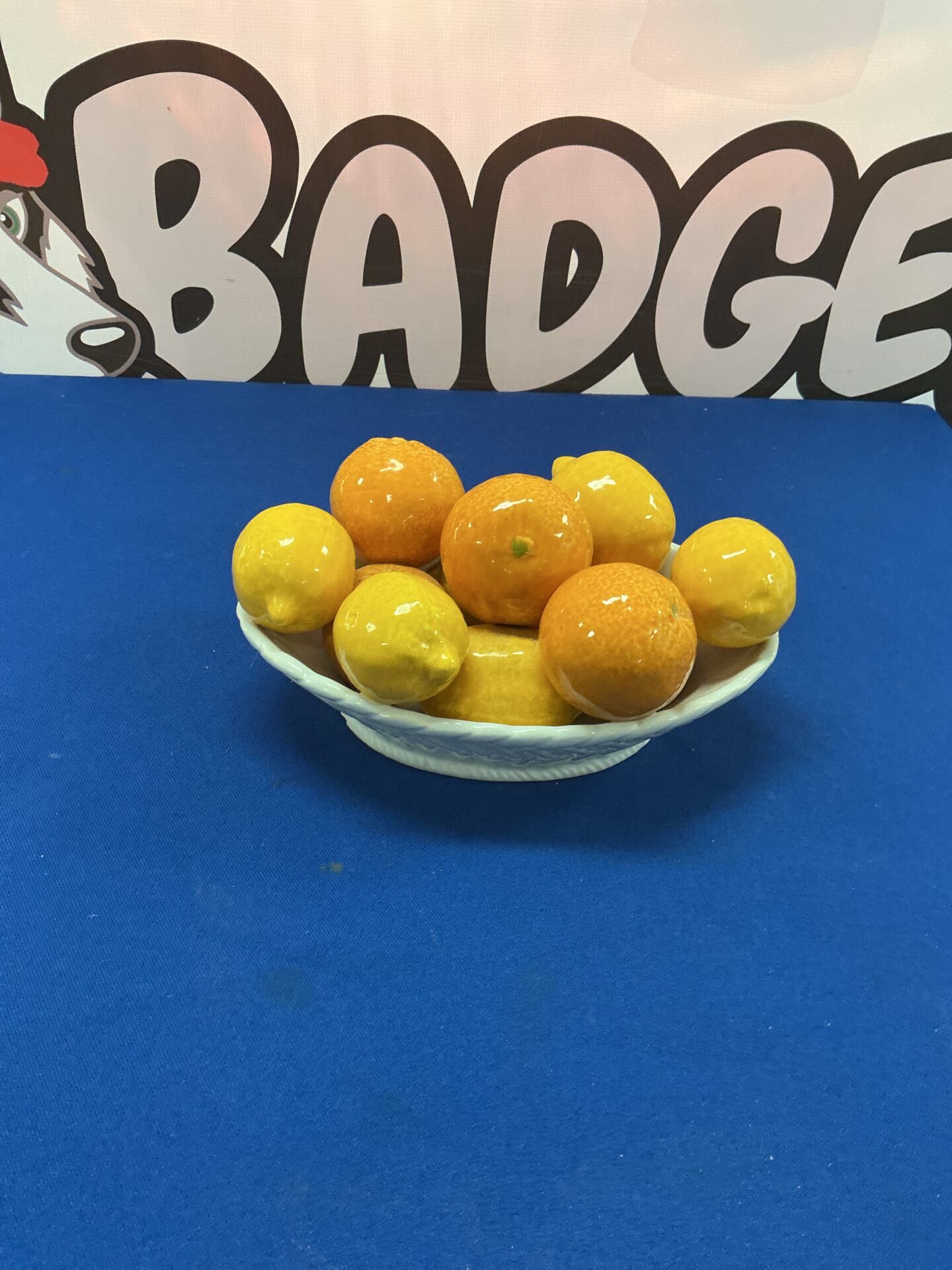 The bowl and fruit appear to be in good condition, though a close inspection may reveal minor imperfections consistent with age and use. This piece would appeal to collectors of vintage ceramics, fruit-themed decor, or those seeking a unique and charming kitchen accent. Its decorative nature and potential as a conversation starter make it a desirable item for both collectors and those looking to add a touch of whimsy to their home.