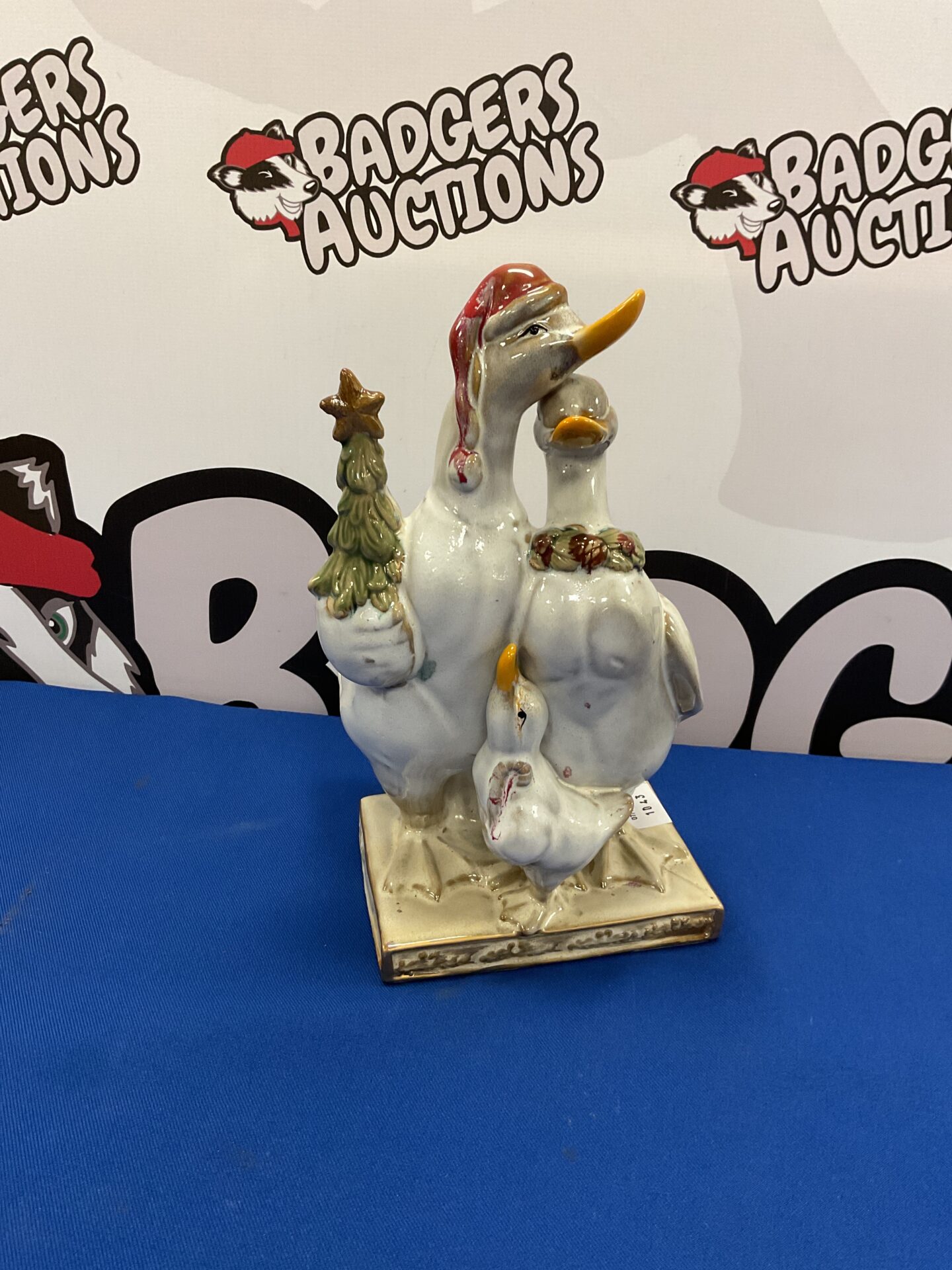 This charming ceramic figurine depicts a family of geese, measuring approximately 10 inches in height. The piece features detailed modelling, capturing the form and texture of the birds. It’s a delightful example of seasonal home decor, likely produced as an ornamental piece for display during autumn or winter.