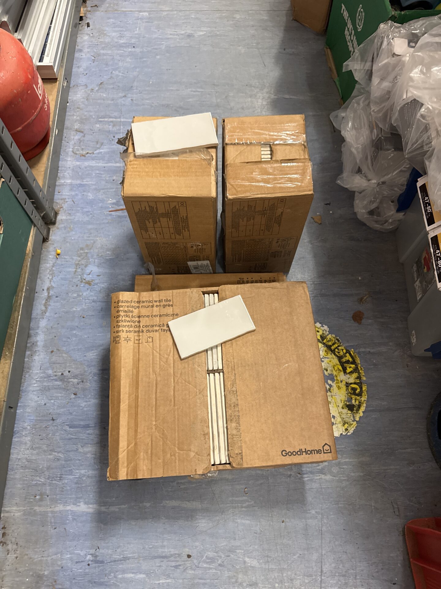 This lot includes four boxes of light grey ceramic wall tiles, each measuring approximately 6” x 3”. Ideal for bathroom or kitchen renovations, these tiles offer a classic, neutral aesthetic. They are offered as seen, with some wear to the packaging, and represent a substantial quantity for a focused tiling project.