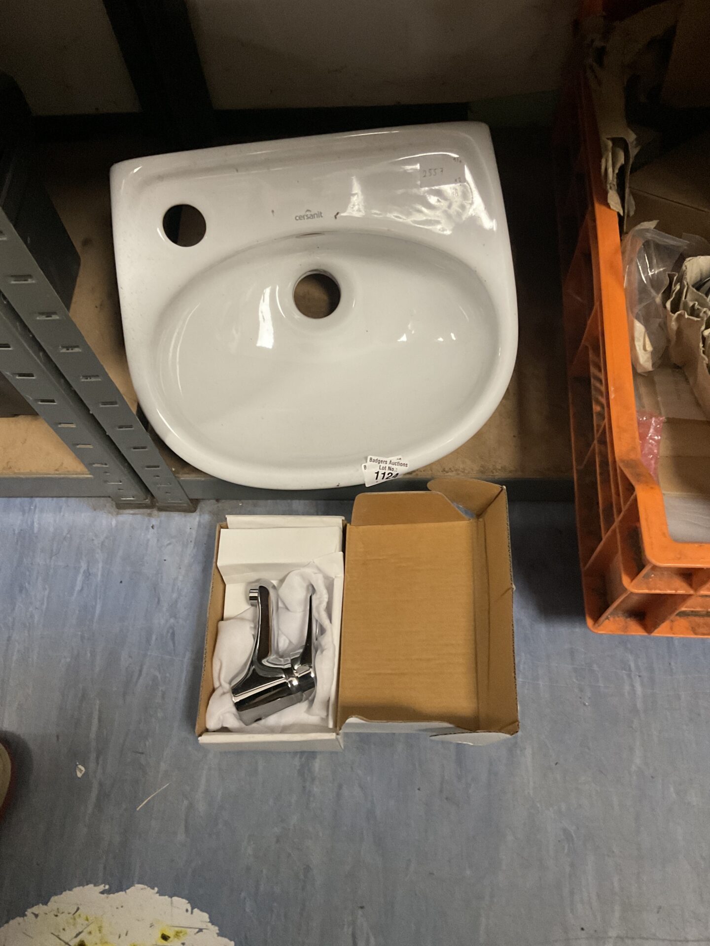 The basin and tap are presented as viewed. While appearing generally sound, a detailed inspection is recommended to assess its suitability for installation. This lot may appeal to those undertaking bathroom renovations or seeking affordable fixtures for smaller spaces.