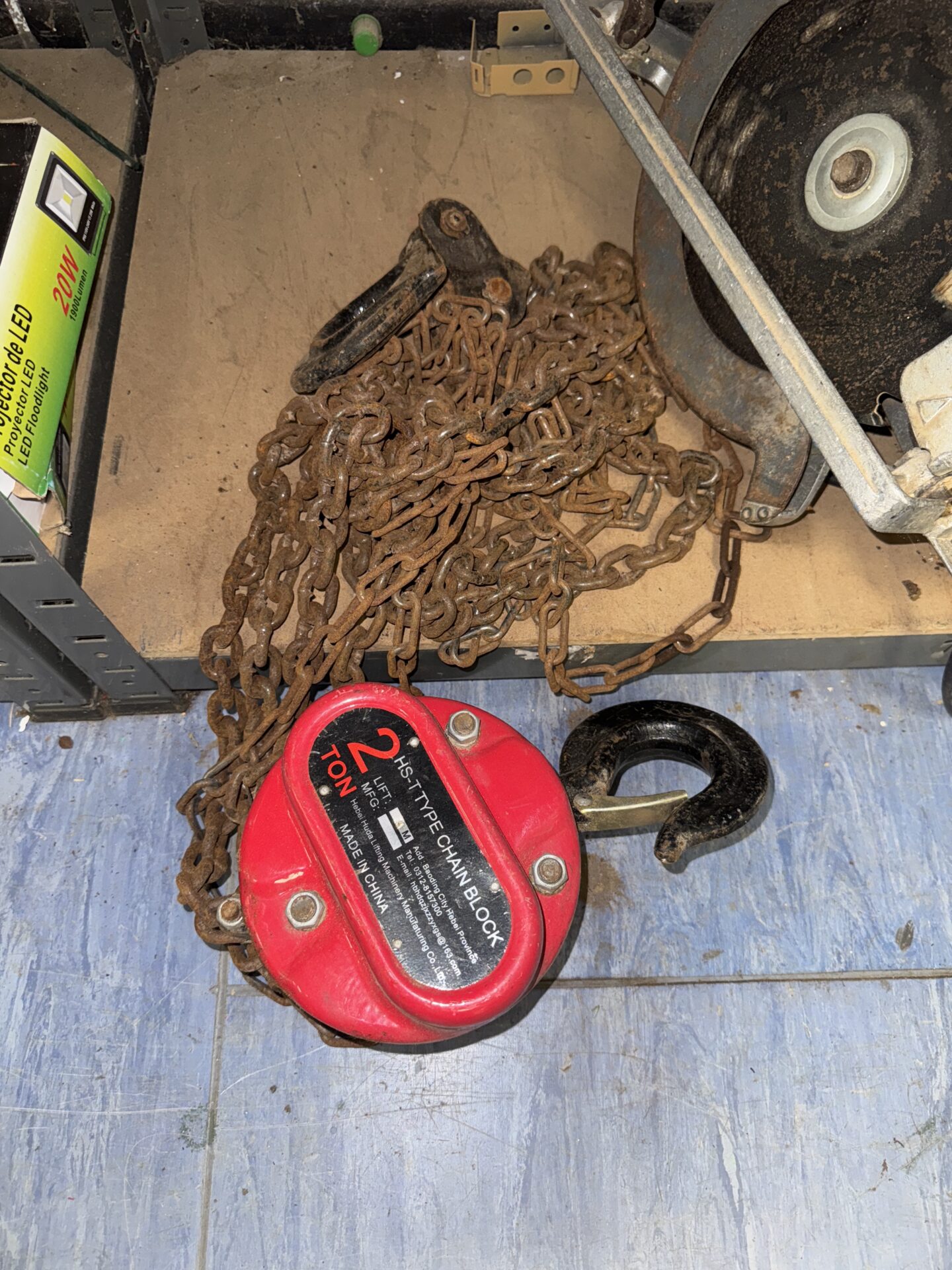 This is a robust 2-ton rated chain block hoist, designed for lifting heavy loads in workshops, garages, or construction sites. The hoist features a durable steel construction and a long chain for convenient operation. It’s a manual lifting device, relying on a ratchet mechanism to raise and lower loads safely and efficiently.