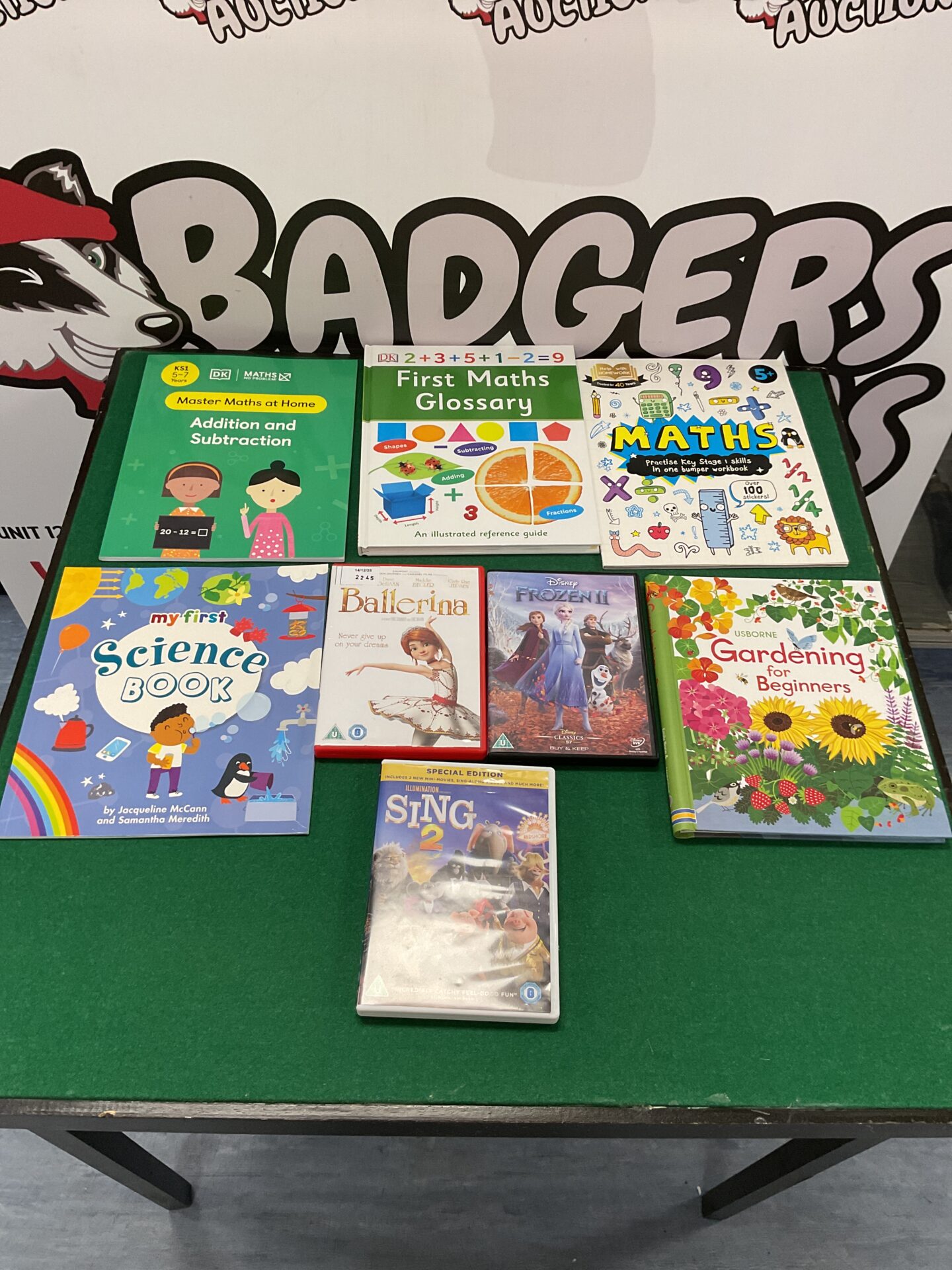 This lot comprises a collection of children’s educational books and three DVDs, including the popular Disney film *Frozen*. The books cover a range of early learning topics, including maths and literacy, designed to support home learning and development. The collection appears to be aimed at preschool and early primary school age children, offering a variety of engaging resources for young learners.