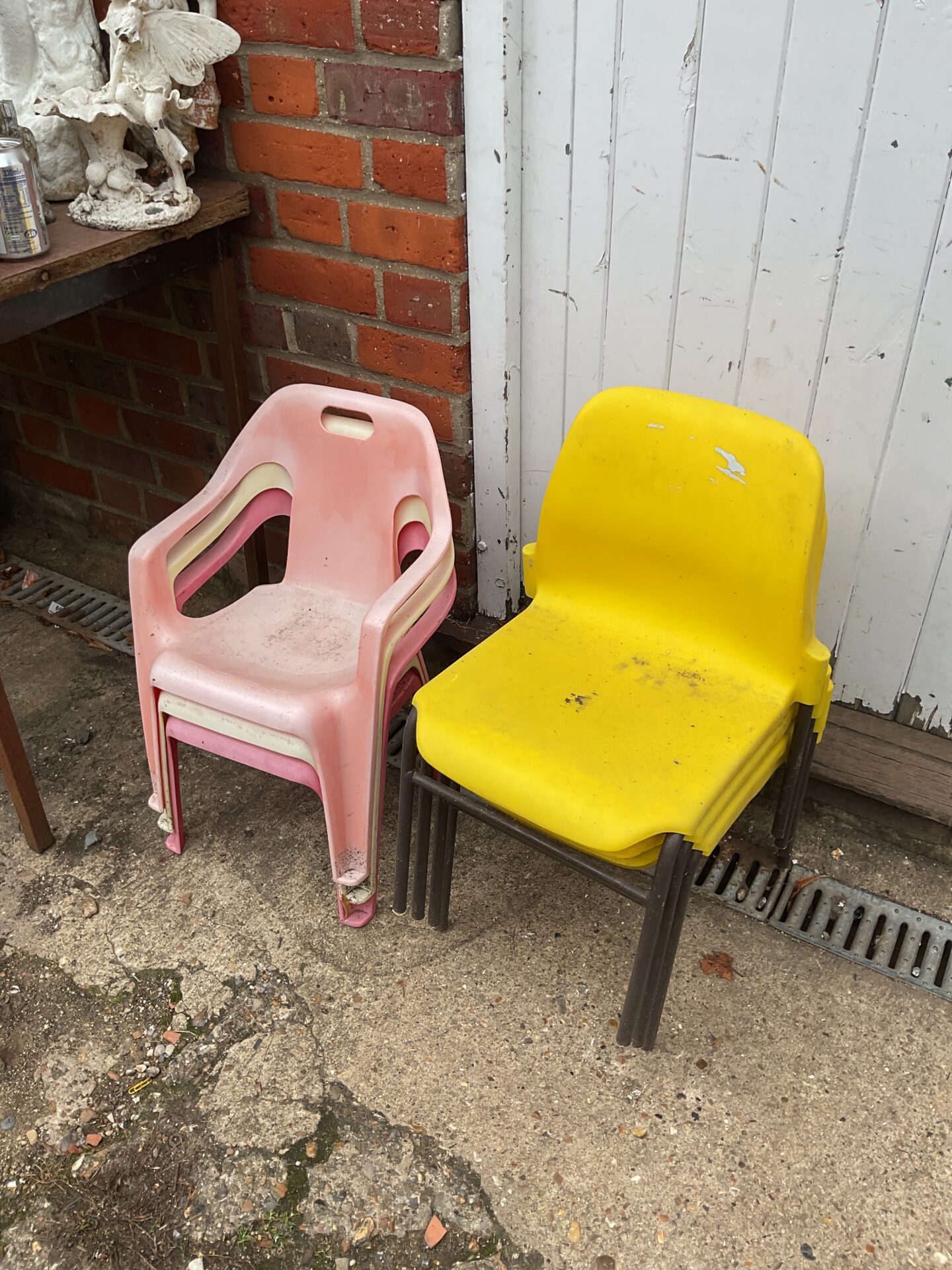 These chairs show signs of wear consistent with age and use, including minor scratches and scuffs to the plastic and some surface rust to the metal frames. Despite this, they remain structurally sound and fully functional. Their vintage aesthetic and practical design make them a desirable addition for collectors of retro furniture or those seeking unique seating for children.