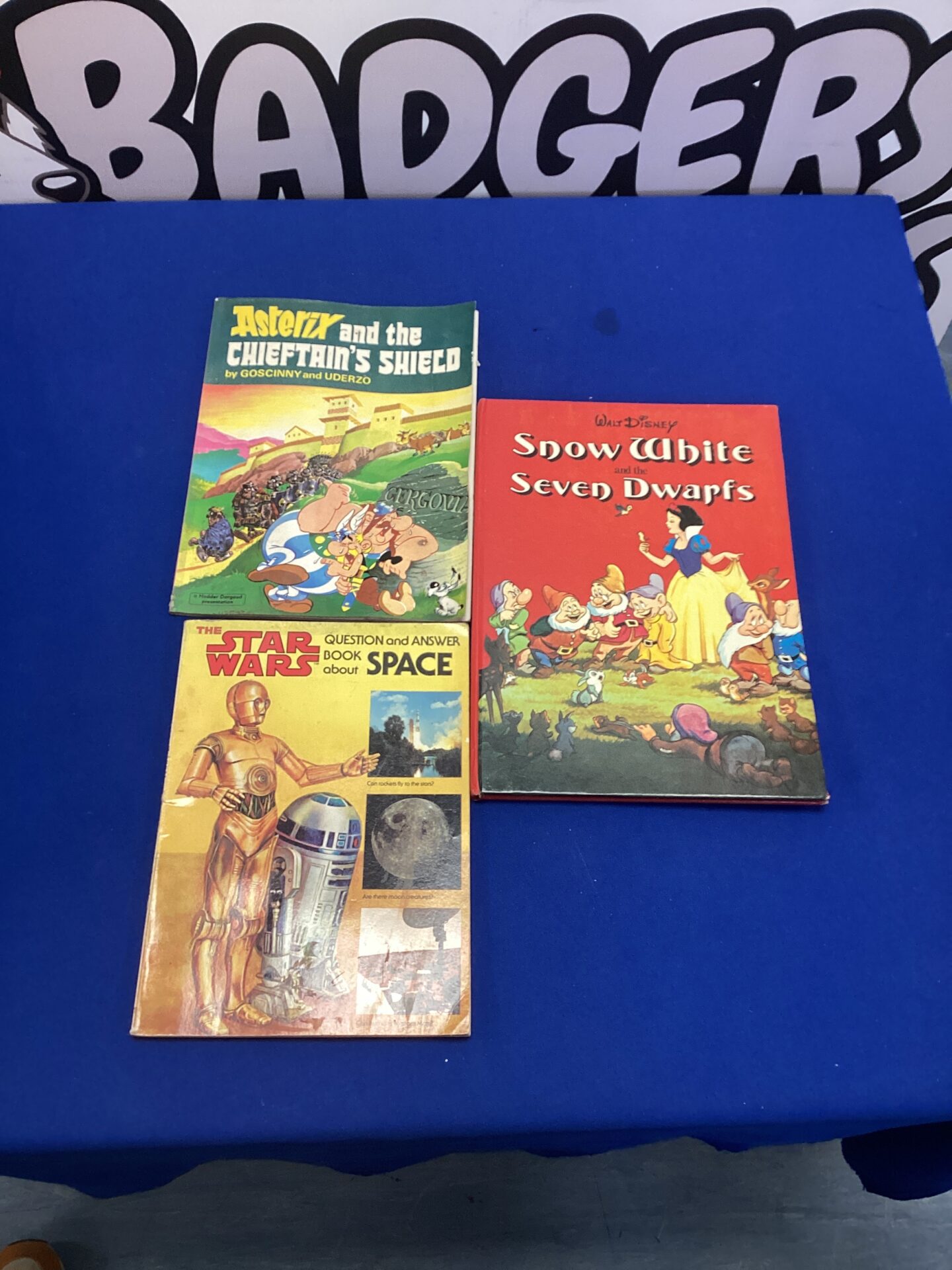 This lot comprises three beloved children’s story books: a classic edition of Snow White, a Star Wars adventure, and an Asterix the Gaul tale. Each book offers a glimpse into fantastical worlds and memorable characters, perfect for introducing young readers to the joy of storytelling or for nostalgic collectors. These books represent a delightful journey through different genres and eras of children’s literature.