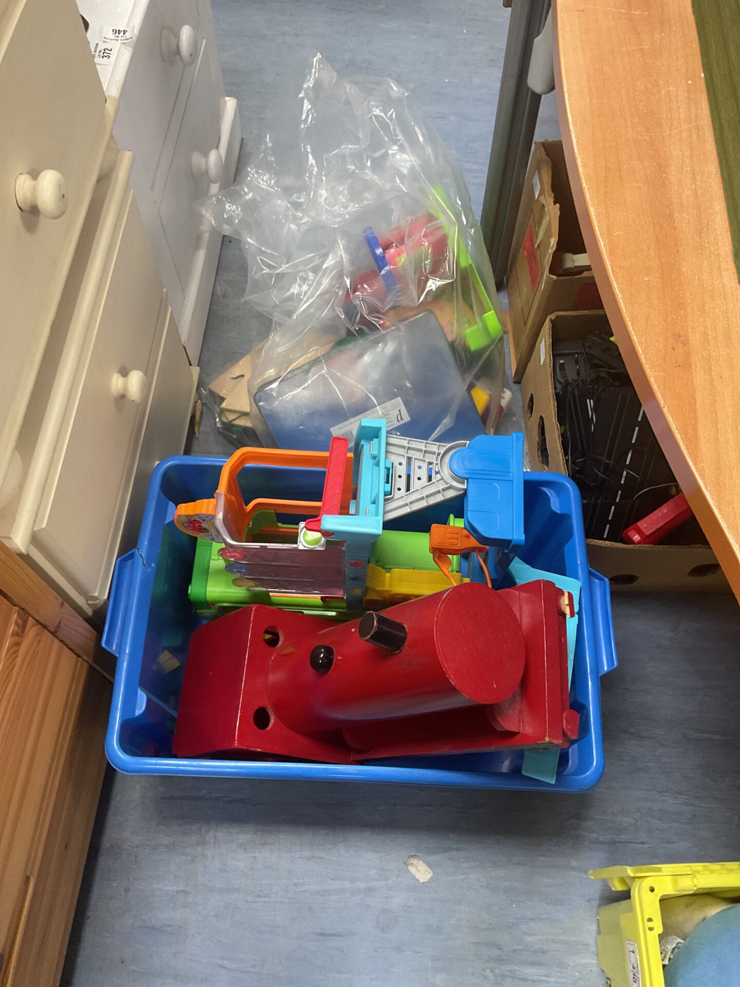 This lot comprises a collection of children’s toys, including a vintage wooden train and various plastic play items. The assortment offers a range of play possibilities, encouraging imaginative and creative play for young children. The collection appears to span different eras, offering a nostalgic element for collectors or parents seeking classic toys.
