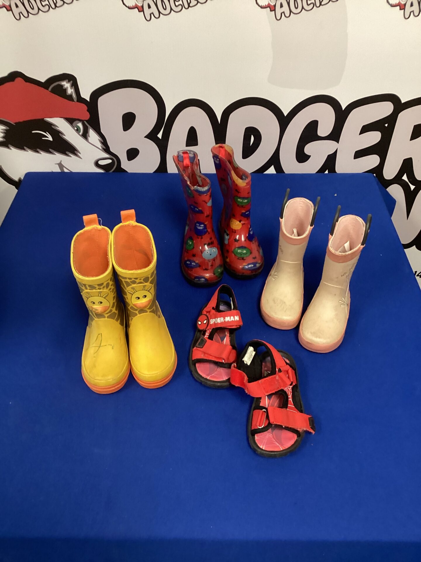 The wellington boots and sandals appear to be in good used condition, showing signs of wear consistent with children’s footwear. This lot would be ideal for parents looking for affordable outdoor footwear for their children, or for collectors of character-themed items. The Spider-Man sandals add a playful touch to the collection, making it a versatile and appealing lot.