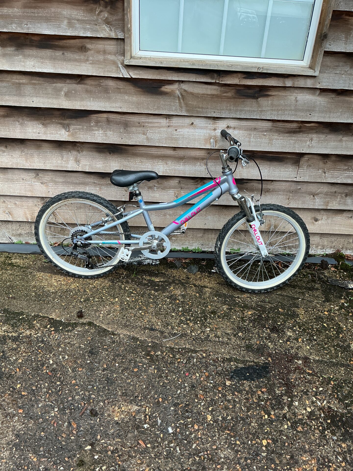 This is a child’s bicycle, presented in a grey and white colour scheme. It features a sloping top tube and appears to be designed for younger riders. The bike has a front suspension fork and what appears to be a single-speed drivetrain.