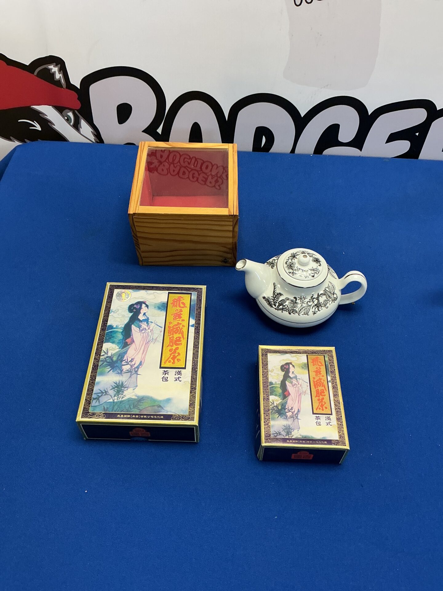 The set appears to be vintage, judging by the style of the box and the aesthetic of the visible porcelain. The condition of the items within the box is not fully discernible from the image, but the box itself shows signs of age and wear. This set would likely appeal to collectors of Chinese porcelain, tea sets, or vintage gift items, and could be a unique addition to a collection or a decorative piece for tea enthusiasts.