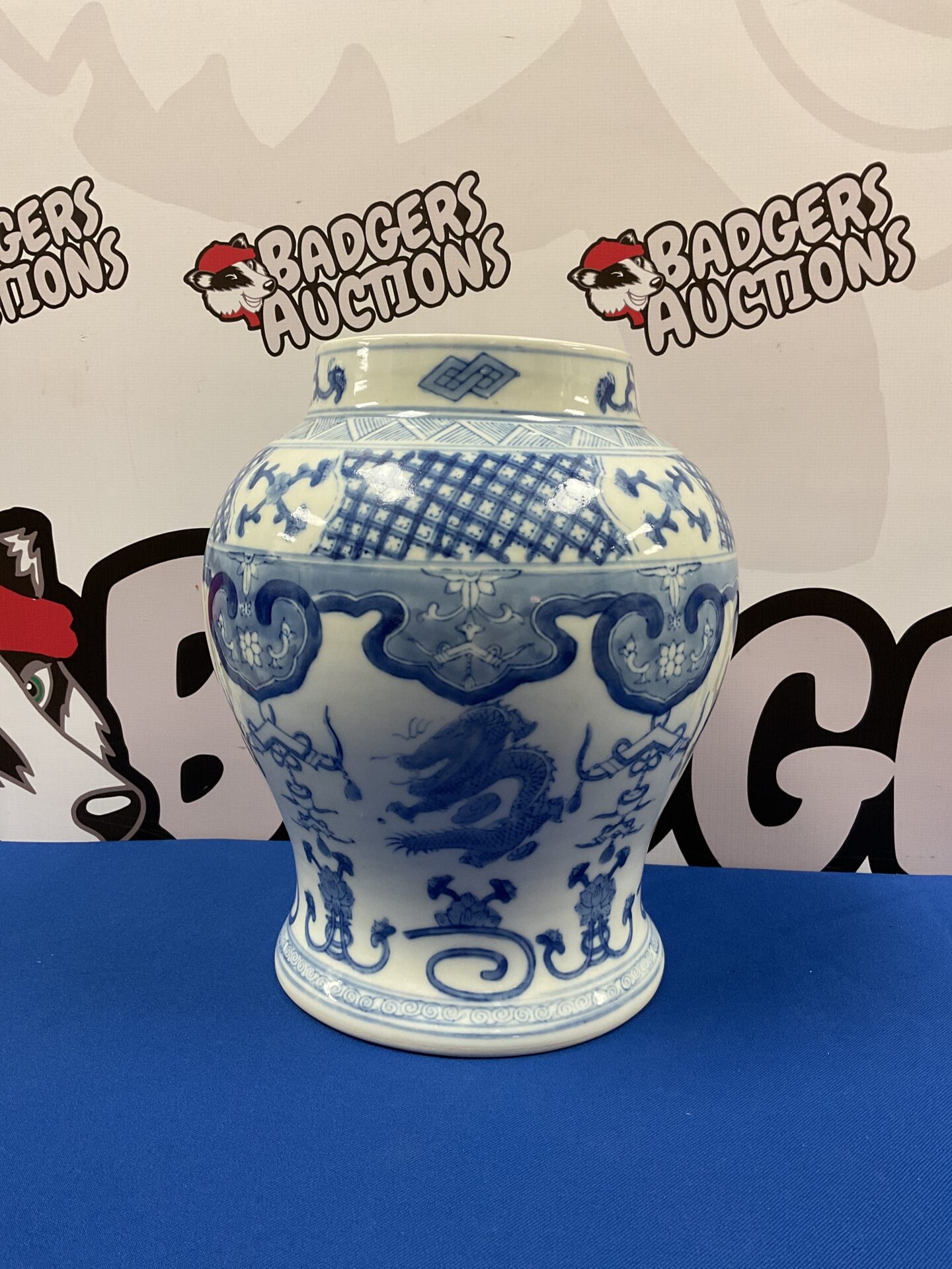 This impressive vase showcases a classic Chinese blue and white design, featuring a detailed dragon motif winding around the body. The porcelain is beautifully crafted, with a smooth glaze and intricate detailing. Standing approximately 12 inches tall, this vase is a striking example of traditional Chinese artistry and would serve as a beautiful decorative piece.