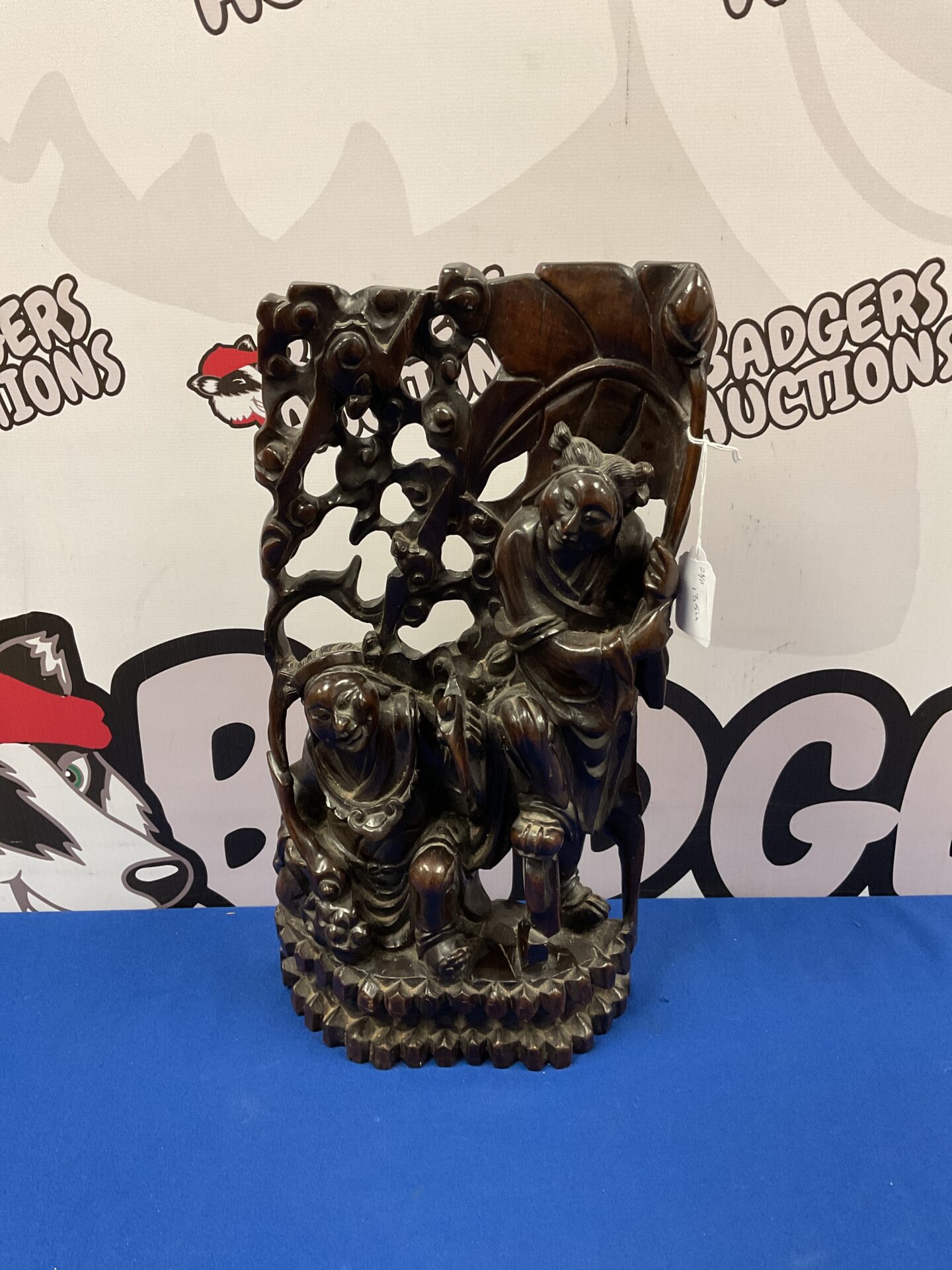 This impressive lot features antique Chinese carved hardwood figures, standing at 44cm tall and 21cm wide. The intricate carvings depict a multi-figure scene, showcasing skilled craftsmanship and attention to detail. The rich, dark tone of the hardwood enhances the visual appeal, suggesting age and quality. This piece likely served as a decorative element or part of a larger display within a traditional Chinese setting.