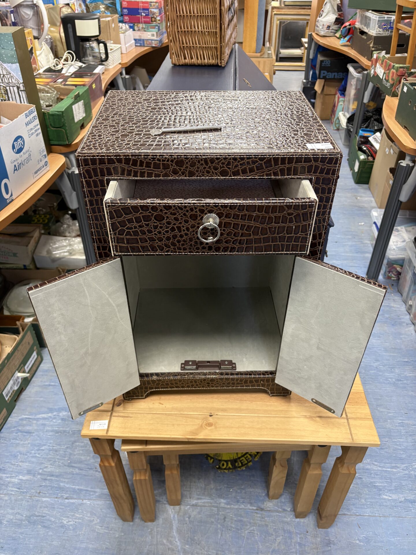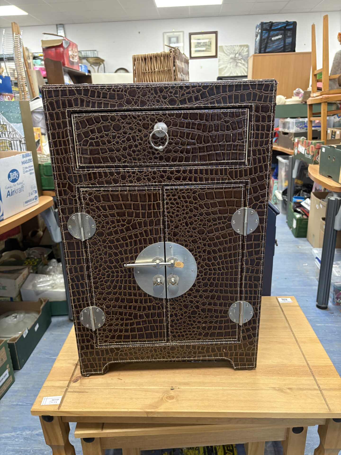 This striking cabinet presents a unique blend of Asian aesthetics and luxurious materials. The cabinet features a crocodile-effect finish, likely a high-quality faux leather or a similar textured material applied to a wooden frame. Its design incorporates traditional Chinese motifs and a distinctive locking mechanism with decorative metal detailing. The cabinet’s construction suggests a focus on both visual appeal and functional storage, with multiple drawers offering ample space.
