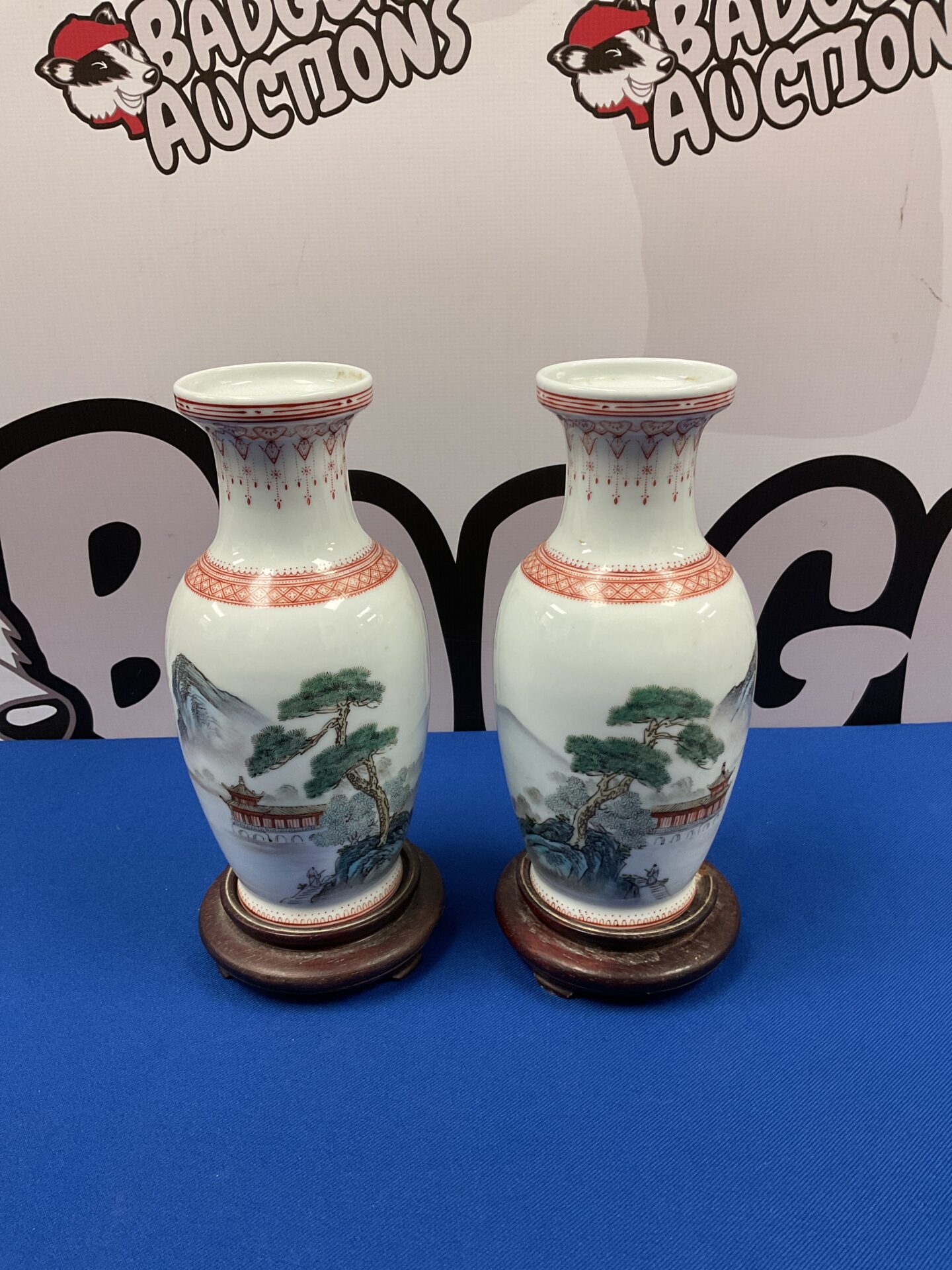 This pair of porcelain vases showcases traditional Chinese artistry. The vases feature a slender form with a flared neck, adorned with hand-painted scenes depicting landscapes and pagodas. The vibrant colours and intricate details suggest a skilled artisan crafted these pieces, and they are mounted on dark wood bases for display.