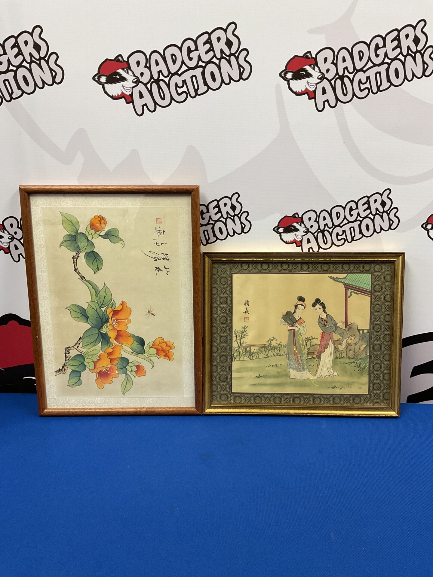 This lot comprises two delicate Chinese watercolour paintings on silk. One depicts elegant ladies in a garden setting, showcasing traditional attire and refined poses. The other portrays a wasp amongst blossoming branches, demonstrating a detailed rendering of nature. Both paintings exhibit a classic Chinese aesthetic, with subtle colour palettes and meticulous brushwork, likely dating from the mid-20th century.