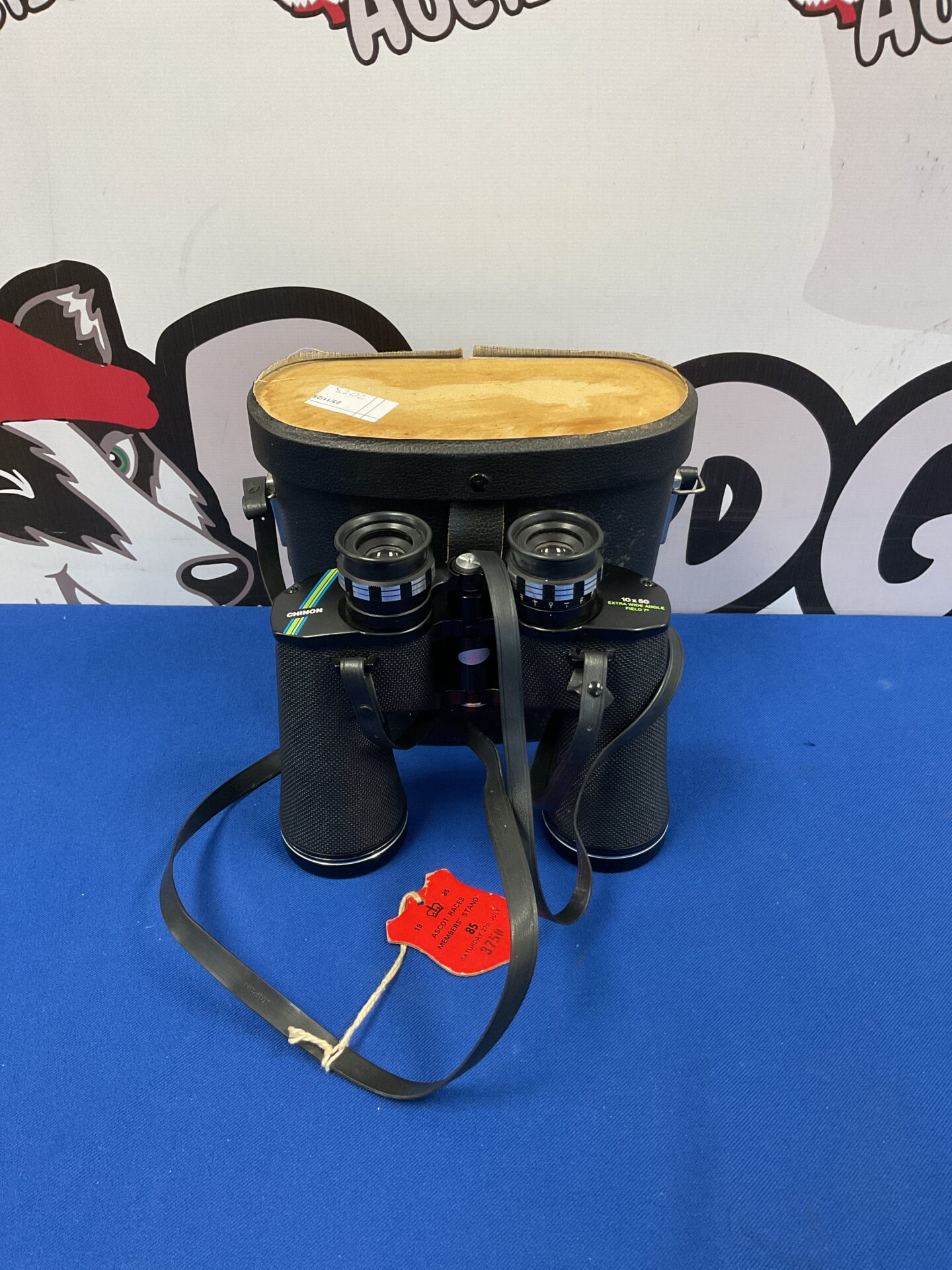 These binoculars appear to be a vintage item, showing signs consistent with age and previous use. While the optics are present, the functionality is not assessed. They may appeal to collectors of vintage optical instruments or those interested in retro technology.