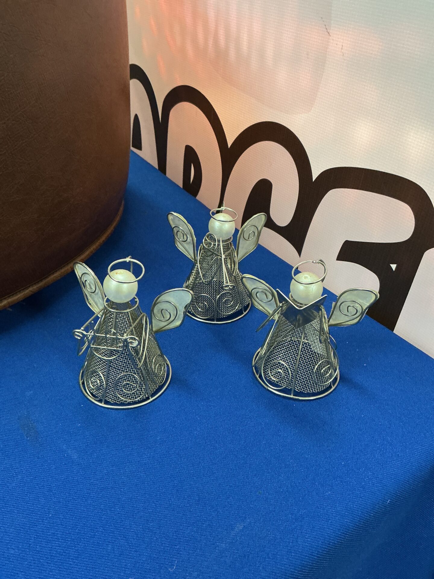 This lot comprises three decorative angels crafted from wire. Each angel features a delicate, open-work design, creating a light and airy aesthetic. The figures are posed in a classic angelic form, suggesting a vintage or retro style, and would likely have been part of a larger Christmas display.