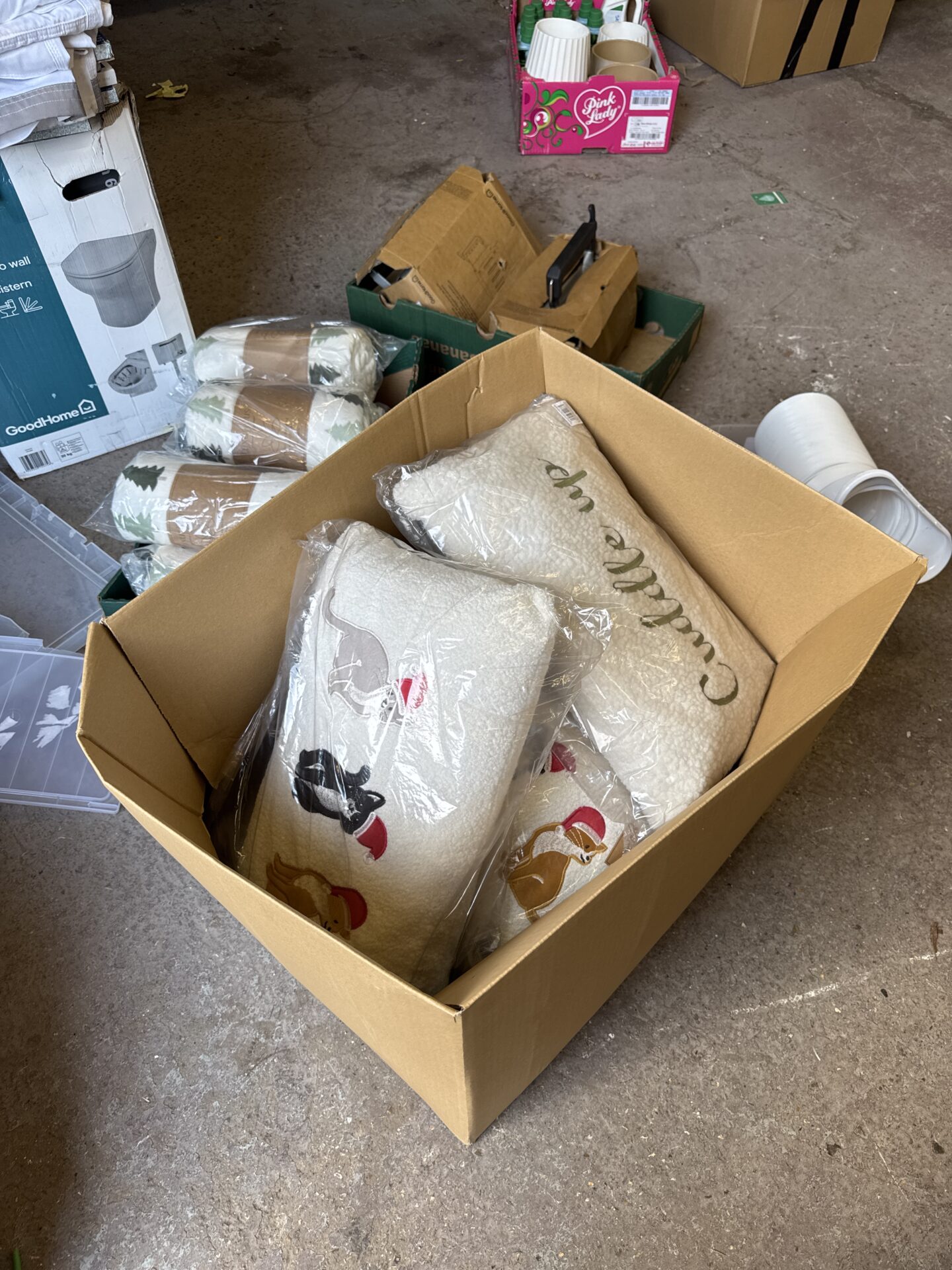 This lot comprises a large quantity of new cushions, predominantly featuring a festive Christmas theme. Many of the cushions depict cats in various Christmas-related designs, adding a playful and seasonal touch to any home. The collection offers a variety of sizes and patterns, suitable for decorating sofas, armchairs, or beds.