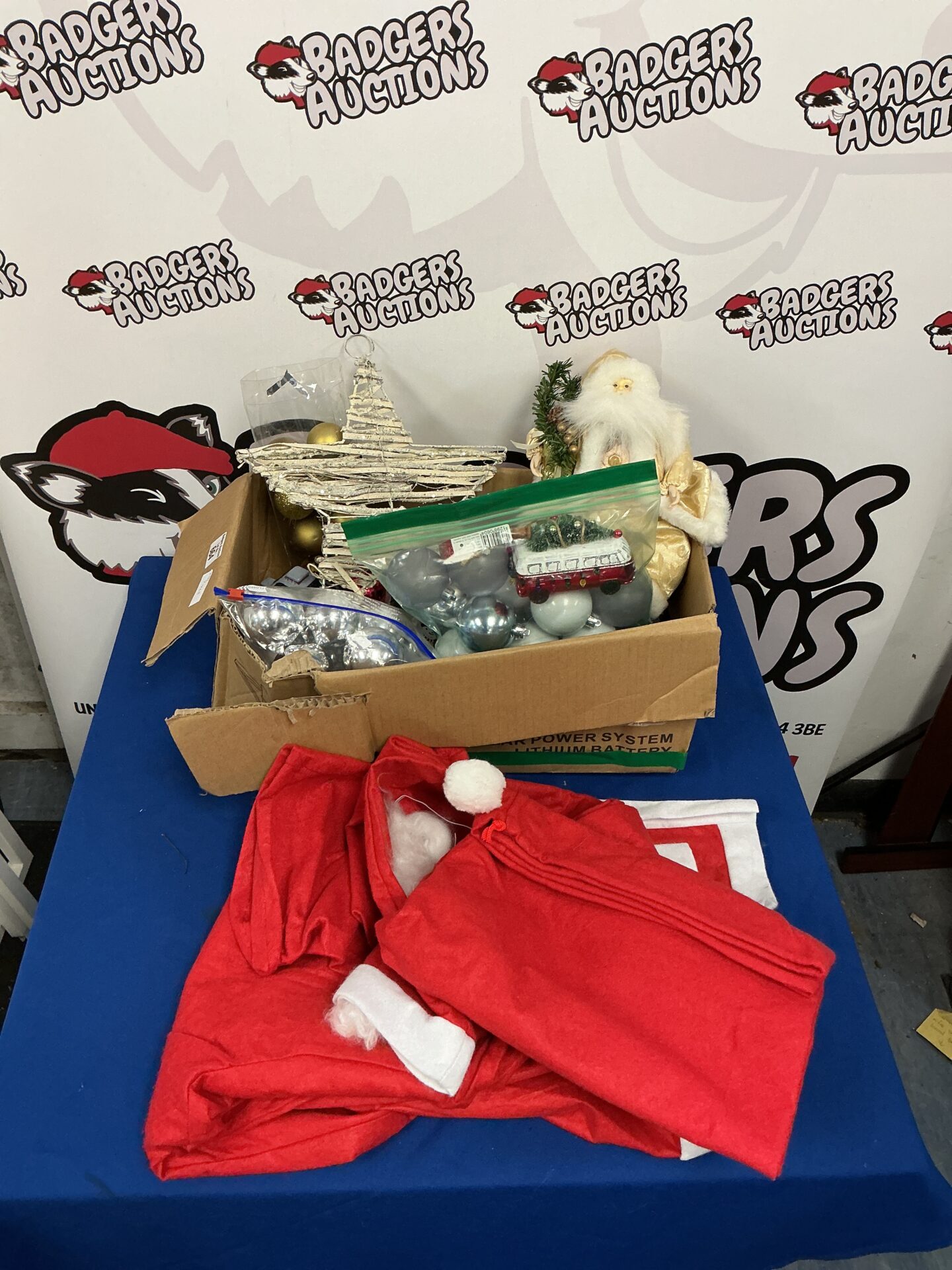 This lot features a box of assorted Christmas decorations, perfect for adding festive cheer to your home. The collection appears to include ornaments and other seasonal items, ready to be unpacked and displayed. A great find for collectors or anyone looking to expand their holiday decor.