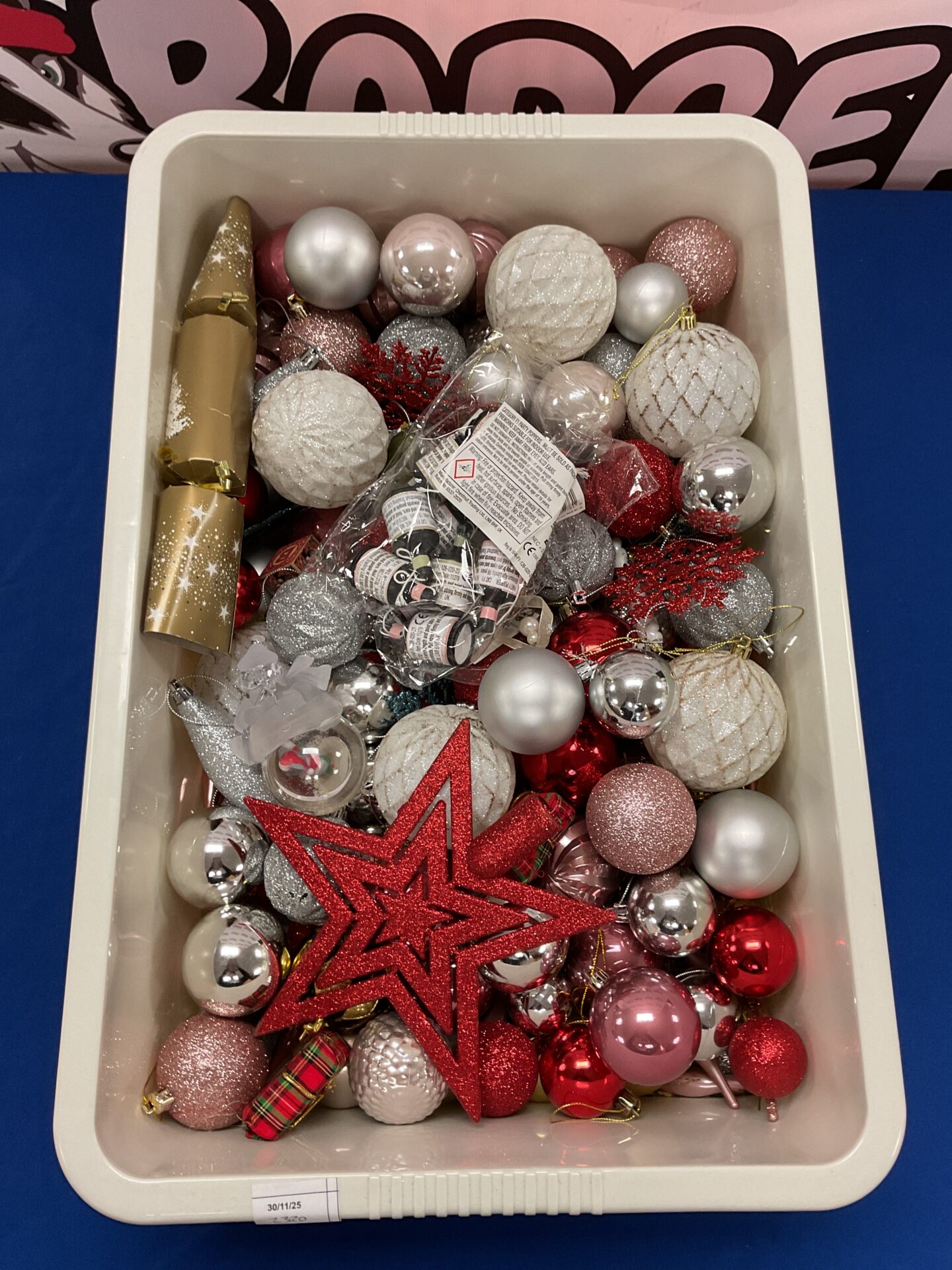 This lot comprises a collection of Christmas decorations, including a variety of baubles in red, gold, and silver finishes. There’s a mix of sizes and textures, with some ornaments featuring glitter and metallic accents. The collection also includes a large star-shaped decoration, adding a festive touch to any holiday display.