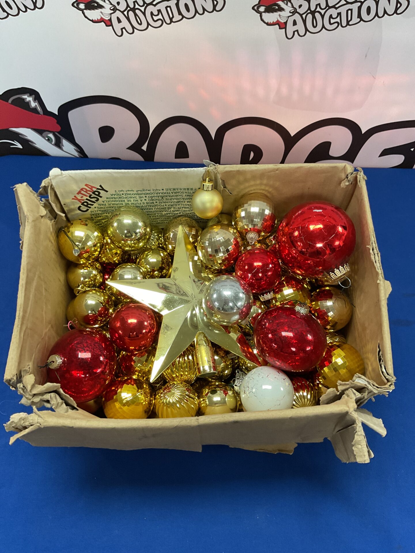 This box contains a collection of vintage Christmas decorations, primarily glass baubles and ornaments. The decorations feature a variety of colours, including red, gold, and green, and exhibit classic Christmas motifs. These ornaments appear to be from a bygone era, offering a nostalgic touch to any festive display.