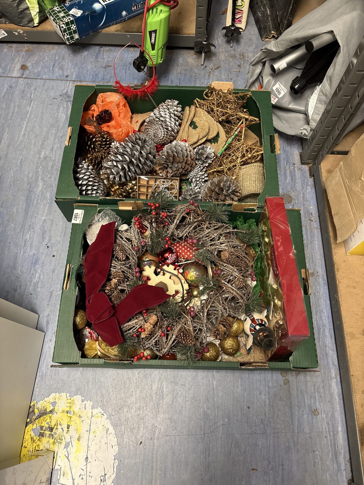 This lot comprises two crates filled with a diverse collection of Christmas decorations. The assortment includes a variety of ornaments, baubles, and festive embellishments, offering a broad range of styles and colours. The decorations appear to span several eras, suggesting a collection built up over time, and providing a nostalgic touch to any holiday display.