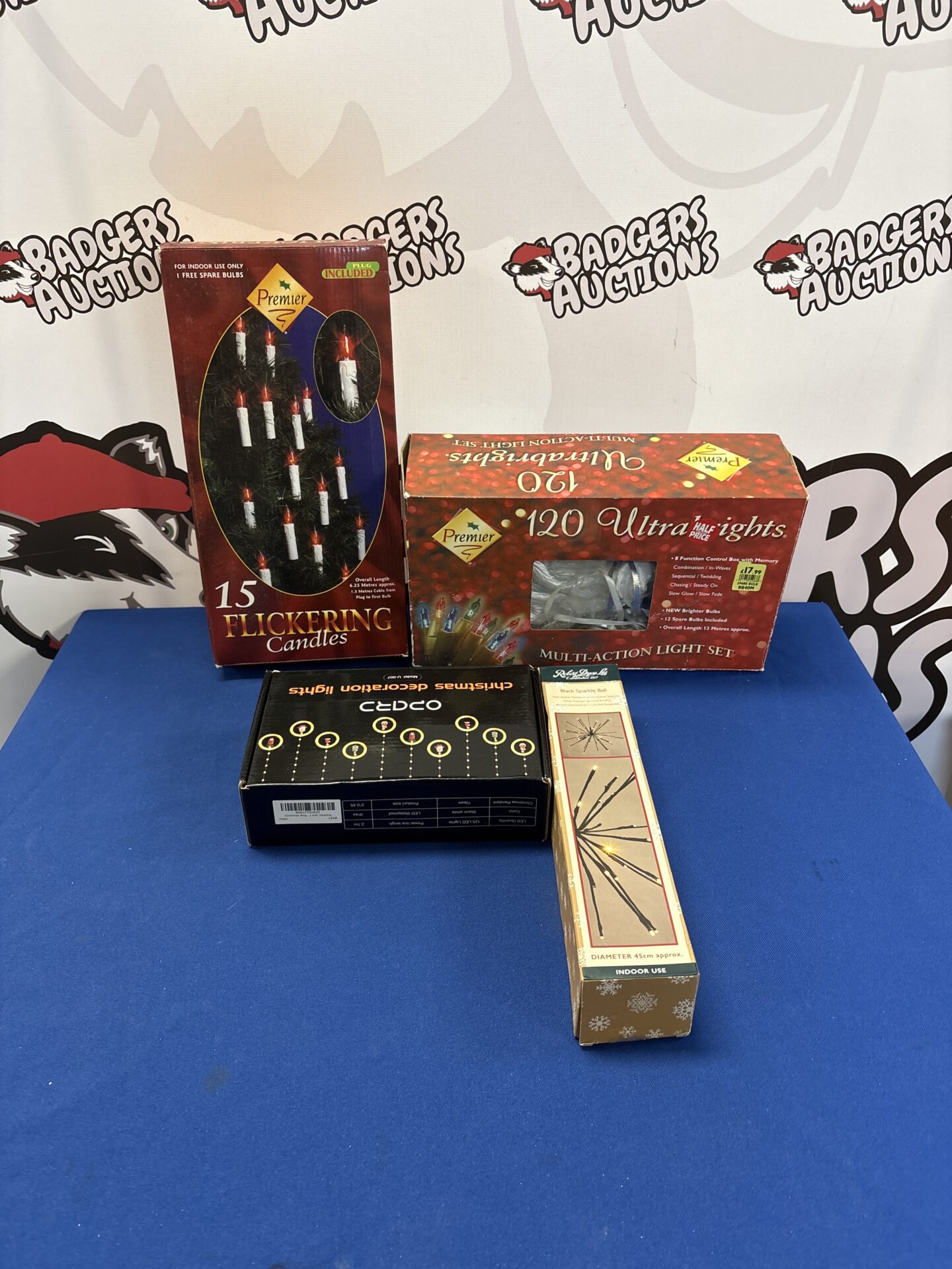 This lot features a selection of Christmas lights, including a Premier 120 light set and flickering LED candles. The lights offer a warm and festive glow, ideal for decorating homes during the holiday season. The flickering candles provide a realistic ambiance, adding a cosy touch to any room.