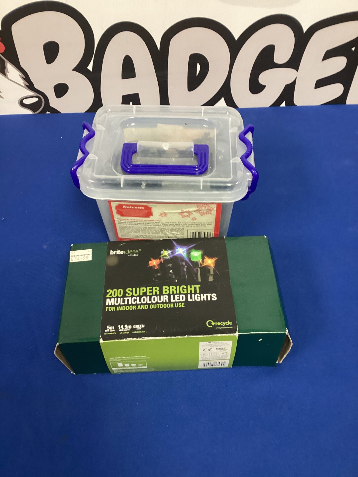These two boxes contain Christmas lights, one appears to be a set of warm white LED chaser lights. The boxes are branded with ‘Brite Ideas’ and contain multiple strands of lights for festive decoration. These lights are intended for creating a warm and inviting atmosphere during the holiday season.