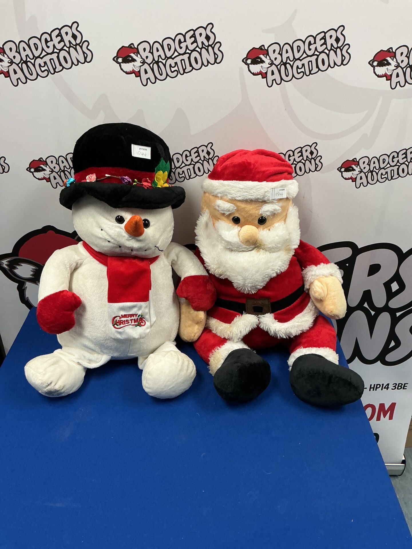 This lot features a charming pair of Christmas soft toys – a classic Santa Claus and a cheerful snowman. Both are constructed from plush materials, designed to bring a touch of festive cheer to any home. The toys exhibit traditional designs, with Santa sporting his iconic red suit and the snowman a classic top hat and carrot nose.