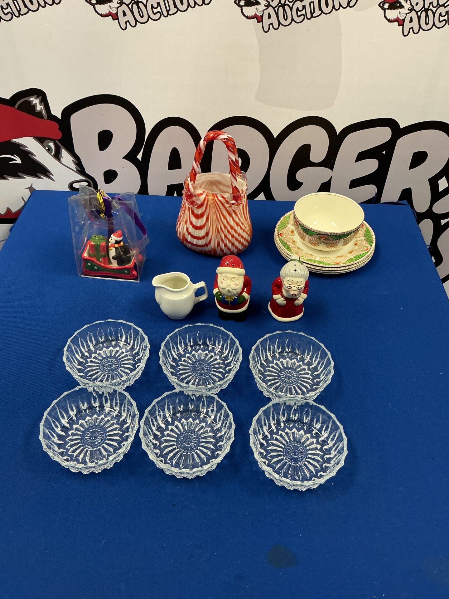 This lot comprises a selection of Christmas-themed tableware, ideal for festive dining. The set includes several small glass dishes, likely intended for serving dips, condiments, or small appetizers. The dishes feature a decorative, starburst-like pattern, adding a touch of sparkle to any holiday table setting.