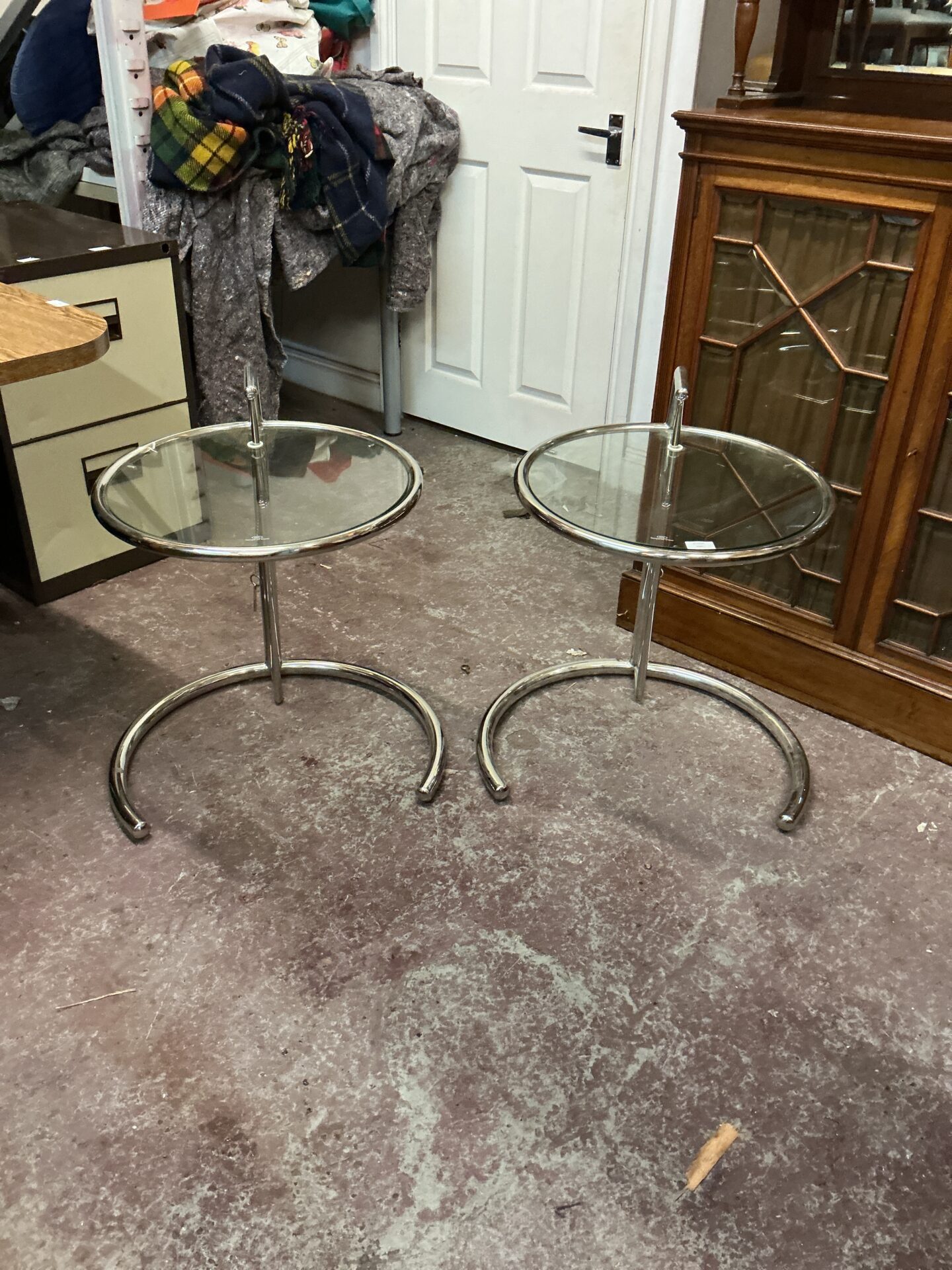 These two coffee tables feature chrome frames supporting circular glass tops. The design allows for height adjustment, offering versatility in placement and use. Their sleek, minimalist aesthetic is characteristic of mid-century modern design, making them a stylish addition to any living space.