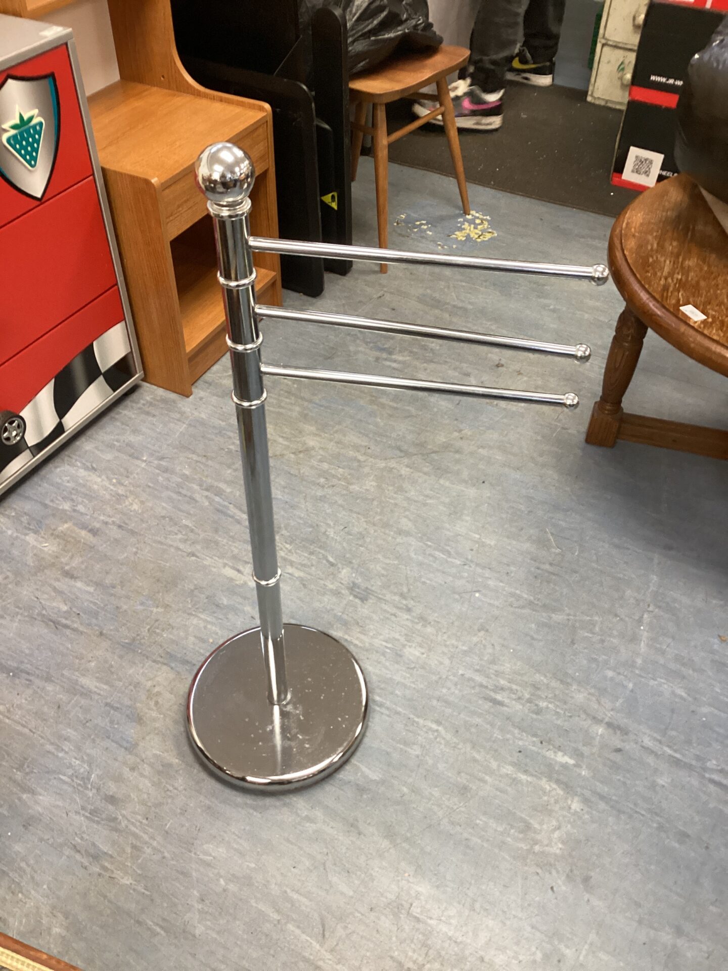 This is a chrome freestanding towel hanger, designed to provide convenient storage in a bathroom or laundry room. The hanger features a circular base for stability and multiple horizontal bars for hanging towels. Its chrome finish offers a sleek, modern aesthetic that would complement a variety of bathroom styles.