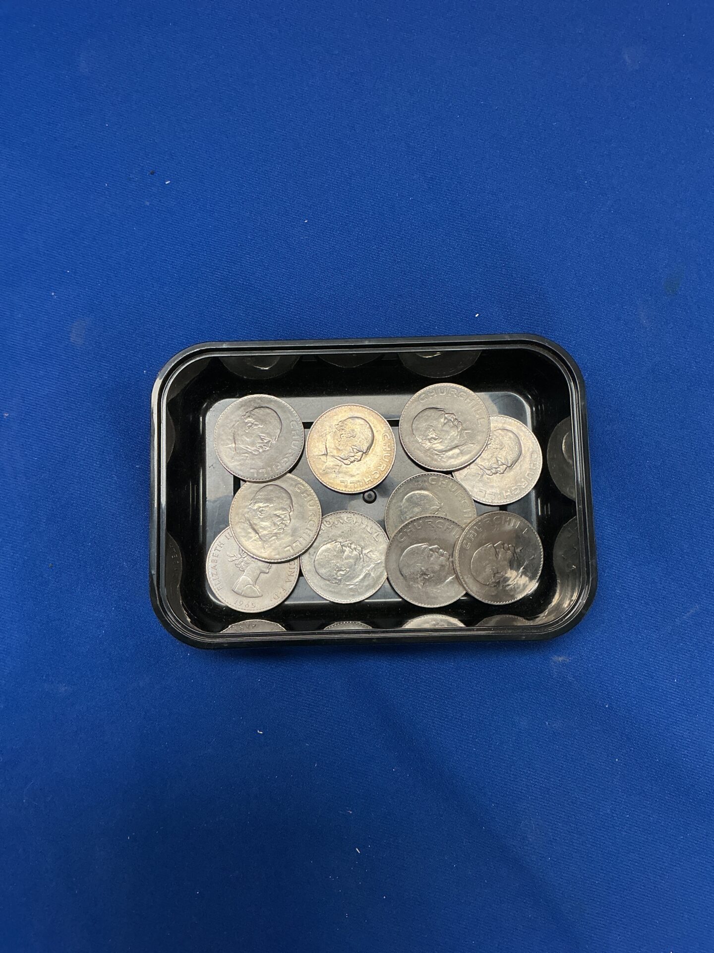 The coins are presented as-found, and their condition varies. While they display visible detail, there may be signs of wear, handling, or minor imperfections consistent with their age and circulation. These coins would be of interest to collectors of British numismatics, Churchill enthusiasts, or those seeking unique historical memorabilia.