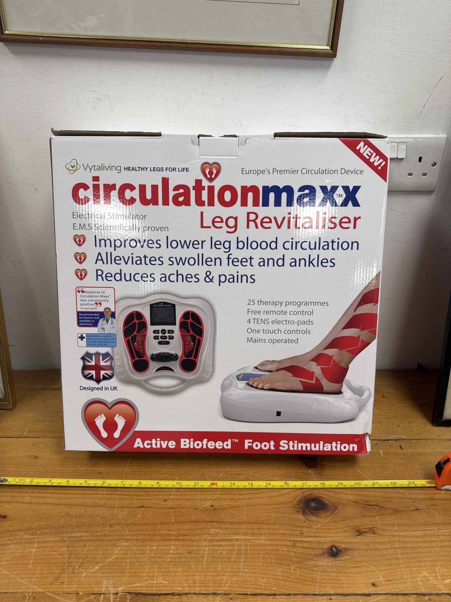 The Circulationmaxx leg revitaliser is a home health device designed to improve circulation in the legs and feet. This model utilises Electrical Muscle Stimulation (EMS) technology to gently stimulate muscles, promoting blood flow and relieving discomfort. It features a user-friendly control panel and is intended for personal use in the comfort of your home. The device is designed to be a non-invasive solution for those seeking to improve their lower limb health.