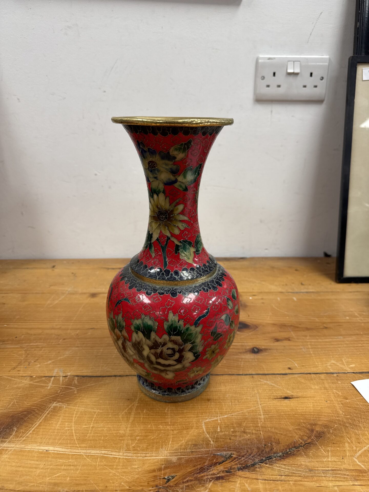 The vase is in good vintage condition, with some minor wear consistent with age and use. The cloisonne enamel is largely intact, with only very minor chips or imperfections. This piece would appeal to collectors of oriental art, vintage home decor, or cloisonne specifically. Its vibrant colours and intricate design make it a visually appealing and unique item.