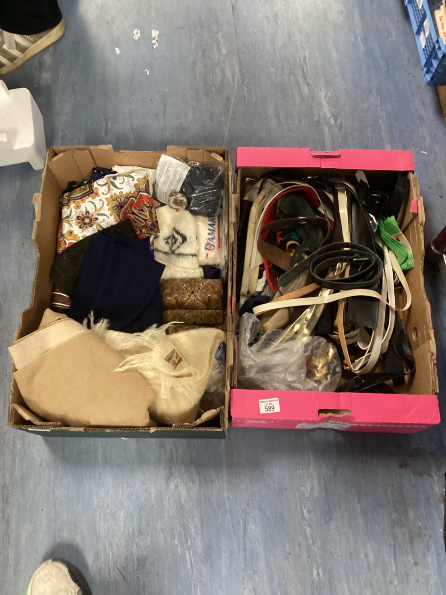 589 Two Boxes Of Max House Clearance Clothing, Including Belts And Scarves And Woolly Hats