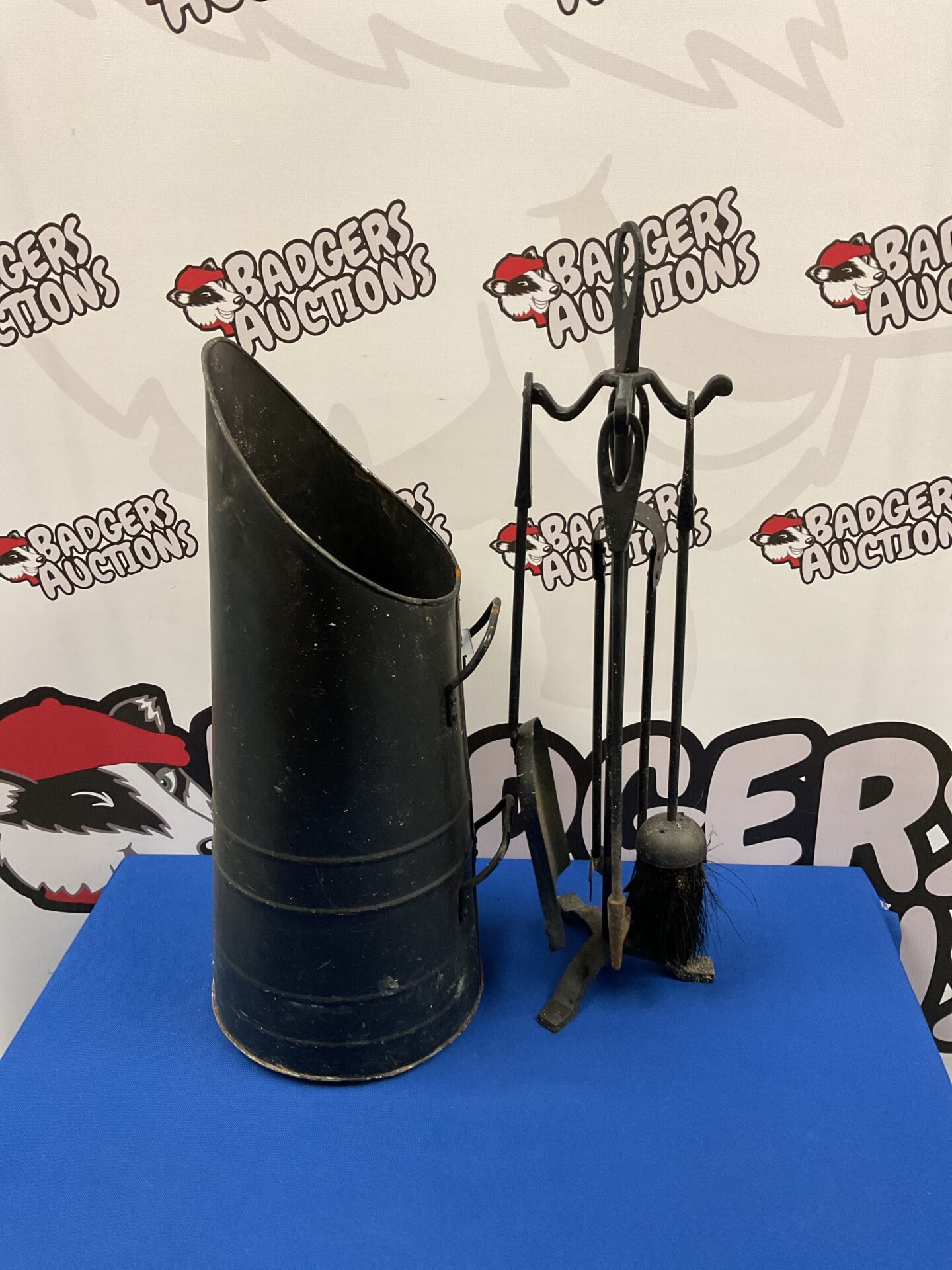 This lot features a classic coal scuttle paired with a coordinating fireplace companion set. The scuttle is constructed from metal, likely steel, and exhibits a traditional bucket shape, designed for holding coal near the fireplace for easy fueling. The companion set includes essential tools for tending a fire, such as a poker, tongs, and a shovel, all designed to work in harmony with the scuttle and maintain a cozy hearth.
