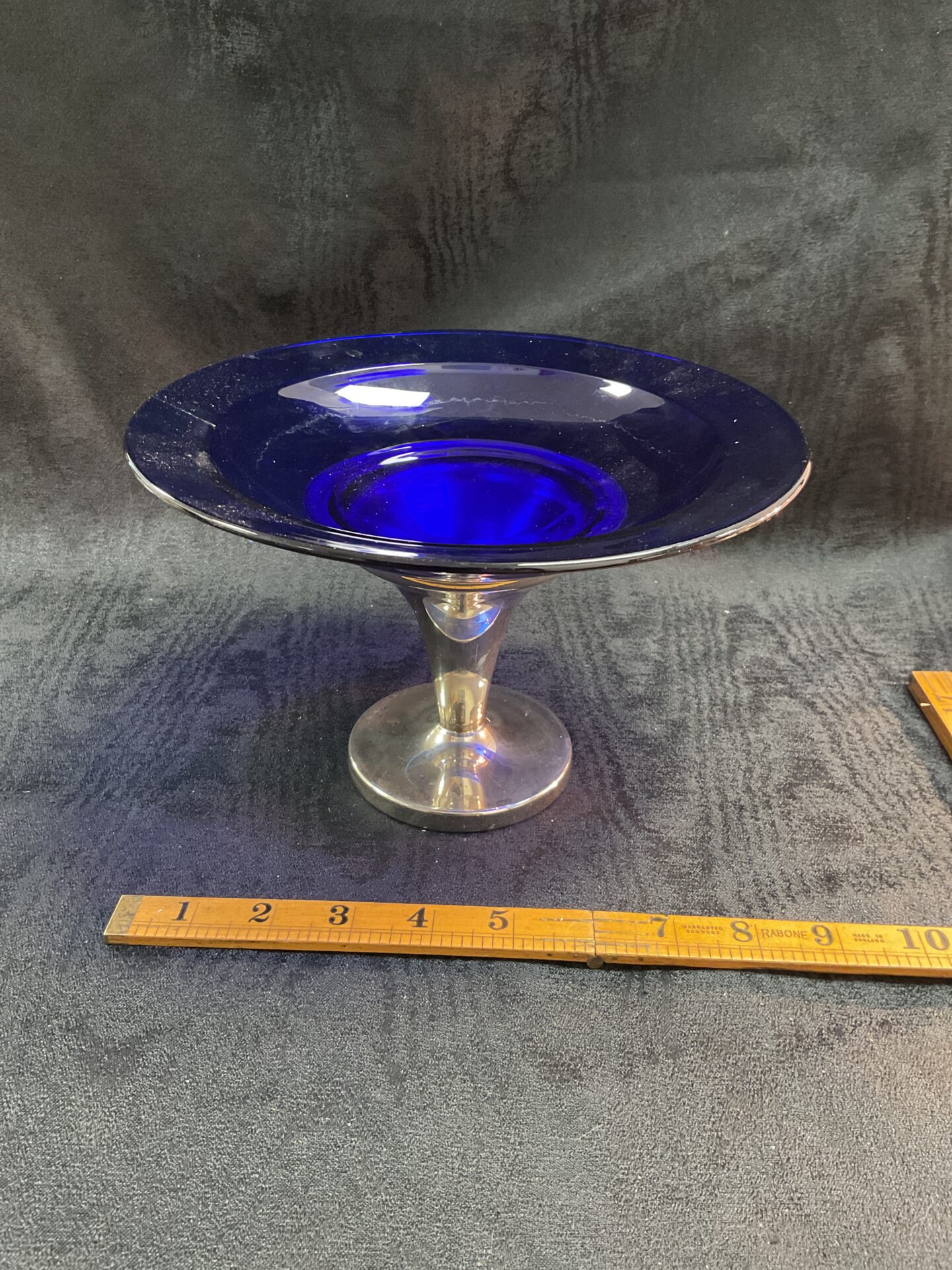 This vintage compote is in good condition, displaying the expected patina of age on the silver plating, which adds to its character and charm. It is a highly collectible piece, particularly for enthusiasts of vintage glassware and silver-plated items. Its striking colour and elegant design make it a desirable addition to any collection or a unique gift for a discerning individual.