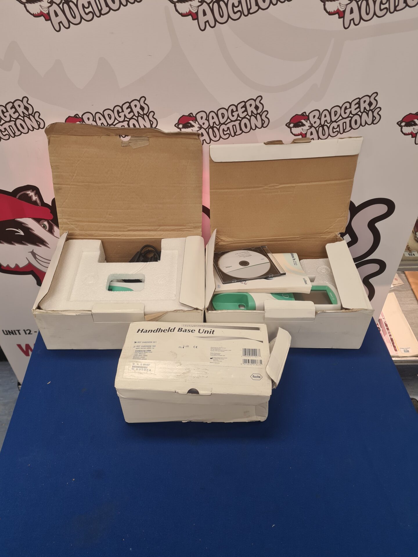 This lot comprises two Roche Cobas handheld power supplies, complete with a base unit. These devices are designed for use with portable diagnostic equipment, providing power for point-of-care testing applications. The units appear to be part of a larger system, intended for use in medical or laboratory settings.